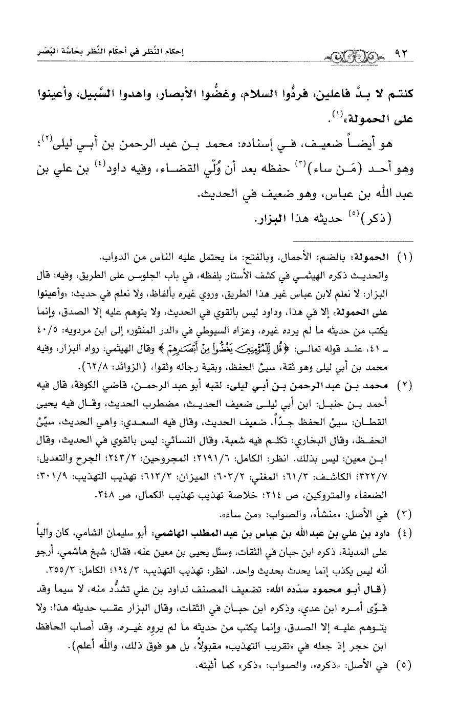 (¬2) محمد بن عبد الرحمن بن أبي ليلى: لقبه أبو عبد الرحمن، قاضي الكوفة، قال فيه أحمد بن حنبل: ابن أبي ليلى ضعيف الحديث، مضطرب الحديث، وقال فيه يحيى القطان: سيئ الحفظ جدًّا، ضعيف الحديث، وقال فيه السعدي: واهي الحديث، سيّئ الحفظ، وقال البخاري: تكلم فيه شعبة، وقال النسائي: ليس بالقوي في الحديث، وقال ابن معين: ليس بذلك. انظر: الكامل: 6/ 2191؛ المجروحين: 2/ 243؛ الجرح والتعديل: 7/ 322؛ الكاشف: 1/ 63؛ المغني: 2/ 603؛ الميزان: 3/ 613؛ تهذيب التهذيب: 9/ 301؛ الضعفاء والمتروكين، ص: 214؛ خلاصة تهذيب تهذيب الكمال، ص: 348.