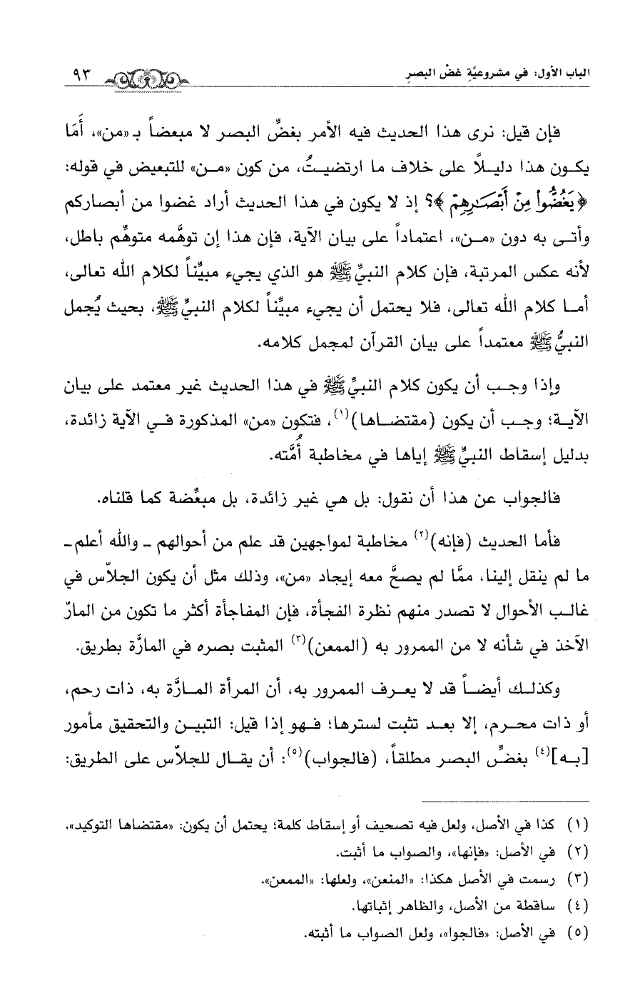 فإن قيل: نرى هذا الحديث فيه الأمر بغضِّ البصر لا مبعضًا بـ "من"، أَمَا يكون هذا دليلًا على خلاف ما ارتضيتُ، من كون "من" للتبعيض في قوله: {يَغُضُّوا مِنْ أَبْصَارِهِمْ}؟ إذ لا يكون في هذا الحديث أراد غضوا من أبصاركم وأتى به دون "من"، اعتمادًا على بيان الآية، فإن هذا إن توهَّمه متوهِّم باطل، لأنه عكس المرتبة، فإن كلام النبيِّ - صلى الله عليه وسلم - هو الذي يجيء مبيِّنًا لكلام الله تعالى، أما كلام الله تعالى، فلا يحتمل أن يجيء مبيِّنًا لكلام النبيِّ - صلى الله عليه وسلم -، بحيث يُجمل النبيُّ - صلى الله عليه وسلم - معتمدًا على بيان القرآن لمجمل كلامه.