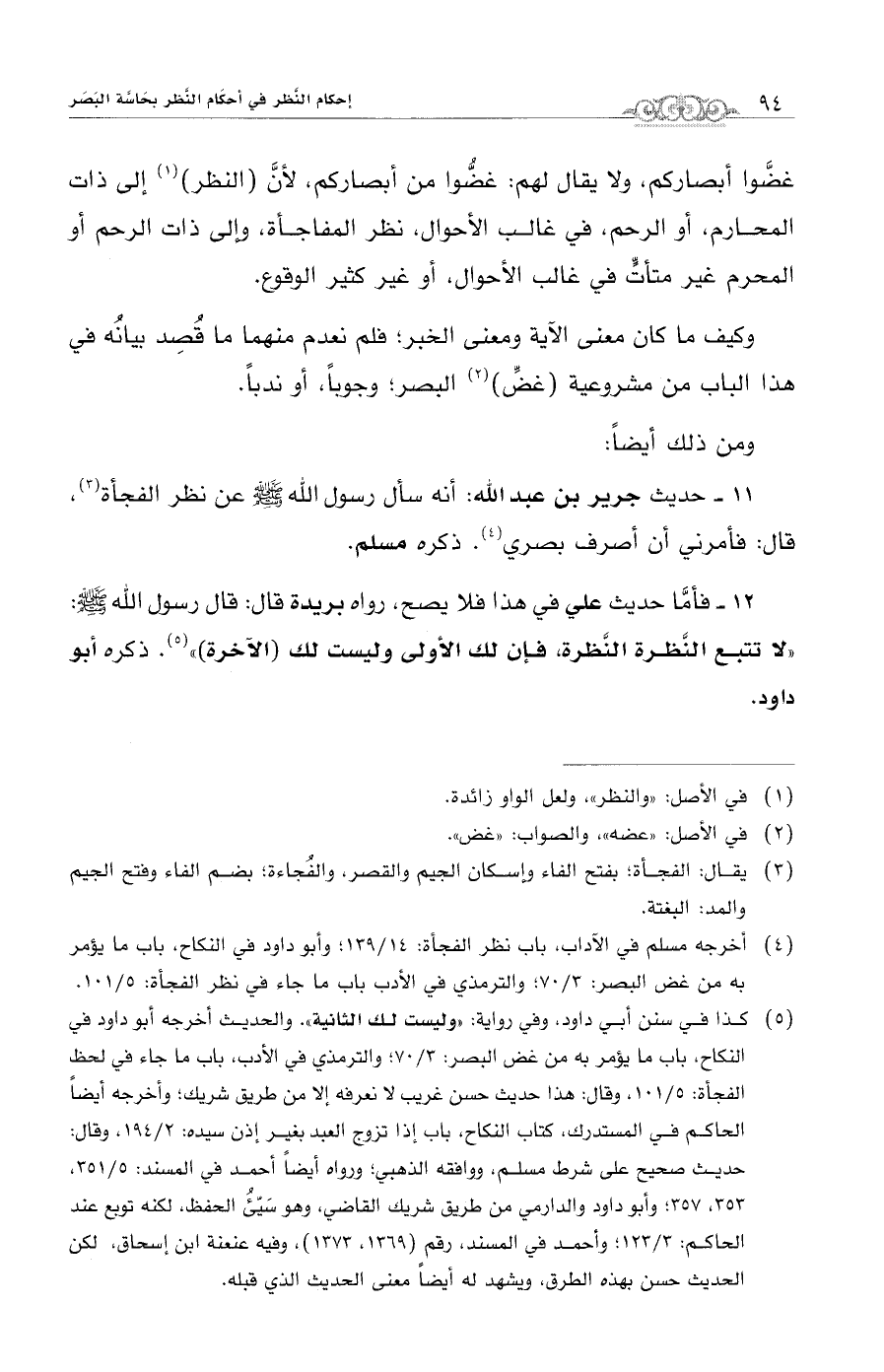 (¬4) أخرجه مسلم في الآداب، باب نظر الفجأة: 14/ 139؛ وأبو داود في النكاح، باب ما يؤمر به من غض البصر: 3/ 70؛ والترمذي في الأدب باب ما جاء في نظر الفجأة: 5/ 101.