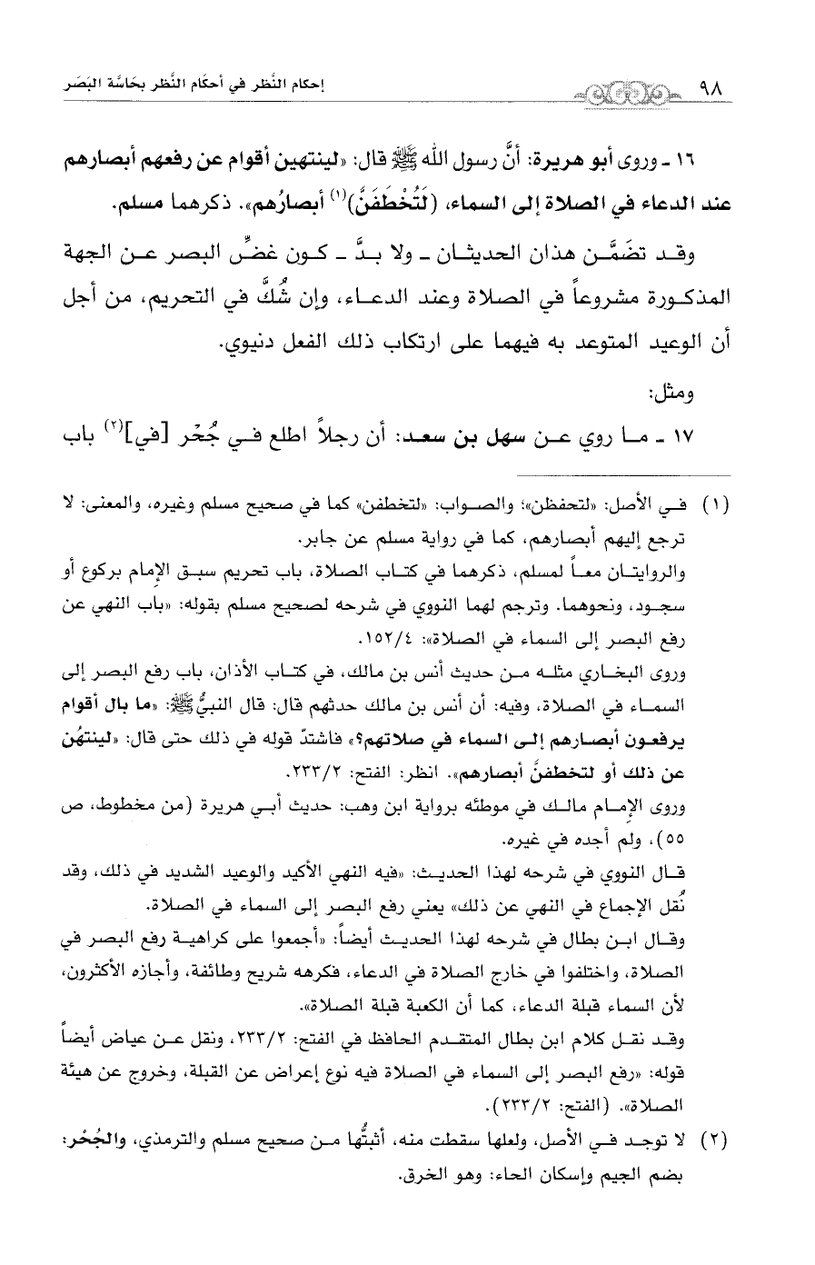 وقد تضَمَّن هذان الحديثان -ولابدَّ- كون غضِّ البصر عن الجهة كورة مشروعًا في الصلاة وعند الدعاء، وإن شُكَّ في التحريم، من أجل أن الوعيد المتوعد به فيهما على ارتكاب ذلك الفعل دنيوي.