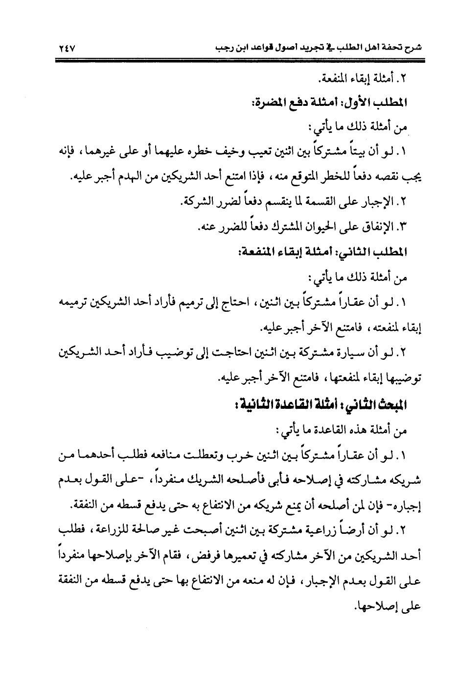 1 - لو أن عقارًا مشتركًا بين اثنين، احتاج إلى ترميم فأراد أحد الشريكين ترميمه إبقاء لمنفعته، فامتنع الآخر أجبر عليه.