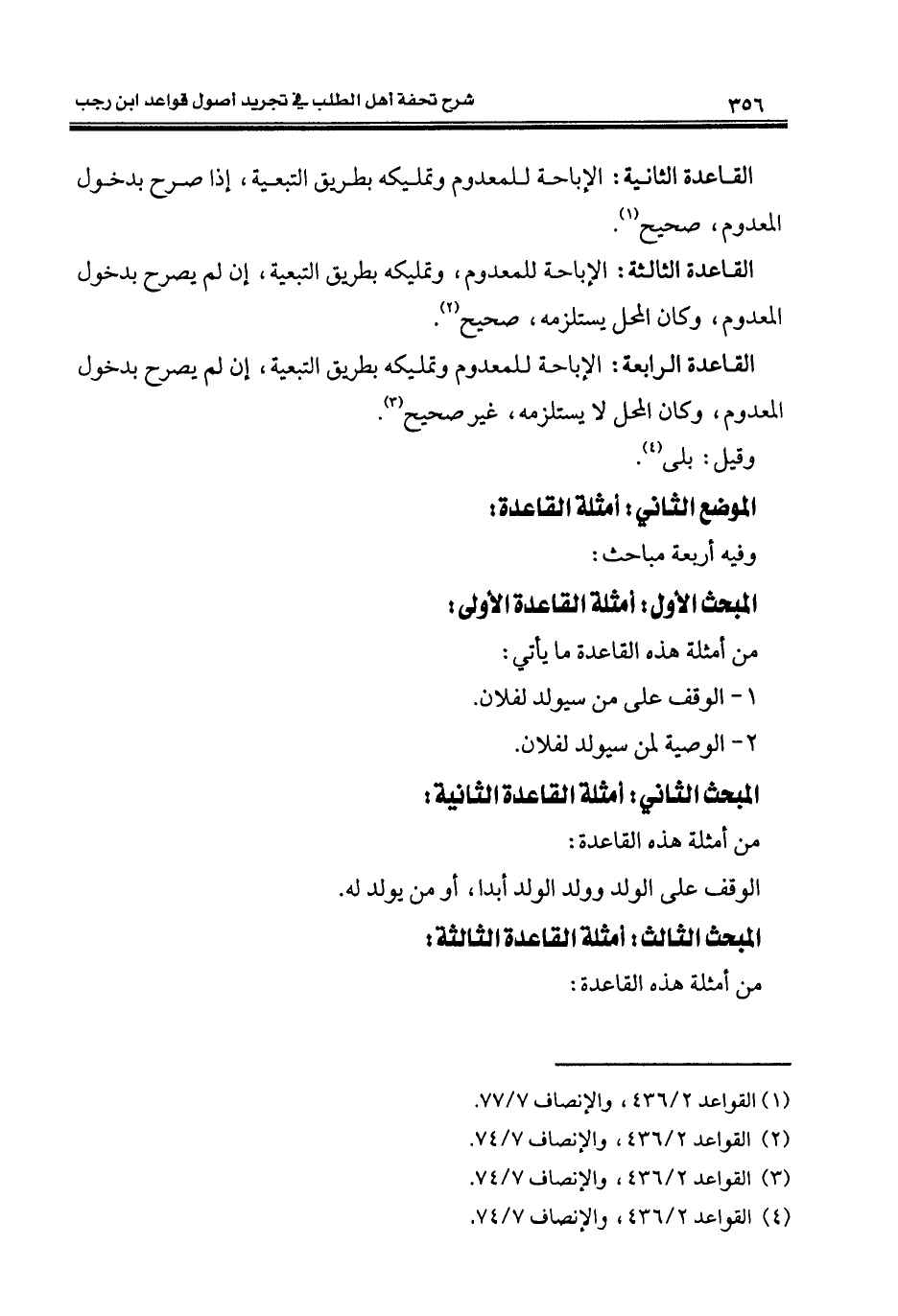 القاعدة الرابعة: الإباحة للمعدوم وتمليكه بطريق التبعية، إن لم يصرح بدخول المعدوم، وكان المحل لا يستلزمه، غير صحيح (¬3).