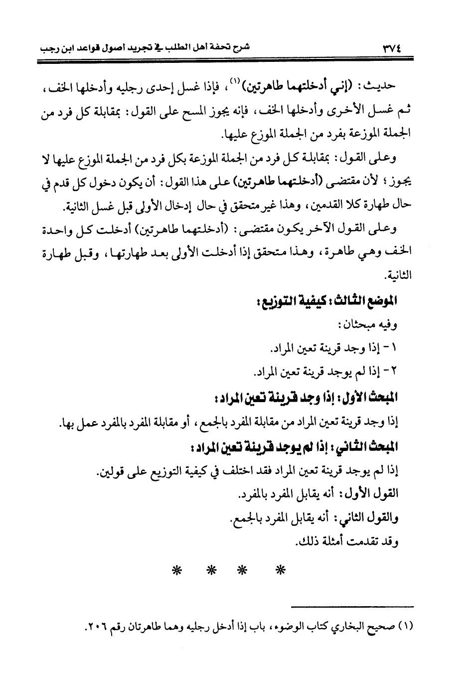 حديث: (إني أدخلتهما طاهرتين) (¬1)، فإذا غسل إحدى رجليه وأدخلها الخف، ثم غسل الأخرى وأدخلها الخف، فإنه يجوز المسح على القول: بمقابلة كل فرد من الجملة الموزعة بفرد من الجملة الموزع عليها.