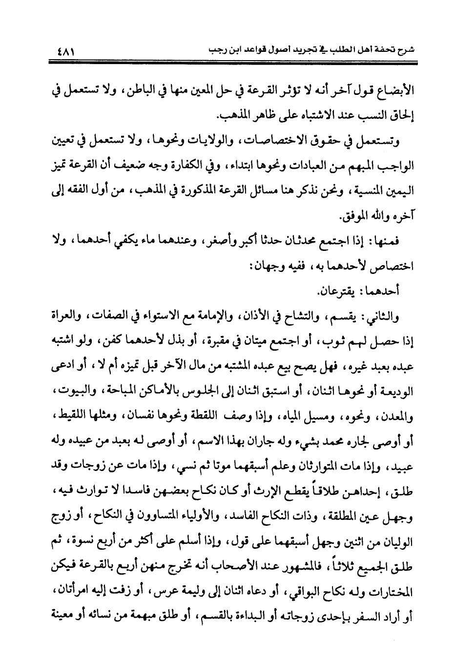 والثاني: يقسم، والتشاح في الأذان، والإمامة مع الاستواء في الصفات، والعراة إذا حصل لهم ثوب، أو اجتمع ميتان في مقبرة، أو بذل لأحدهما كفن، ولو اشتبه عبده بعبد غيره، فهل يصح بيع عبده المشتبه من مال الآخر قبل تميزه أم لا، أو ادعى الوديعة أو نحوها اثنان، أو استبق اثنان إلى الجلوس بالأماكن المباحة، والبيوت، والمعدن، ونحوه، ومسيل المياه، وإذا وصف اللقطة ونحوها نفسان، ومثلها اللقيط، أو أوصى لجاره محمد بشيء وله جاران بهذا الاسم، أو أوصى له بعبد من عبيده وله عبيد، وإذا مات المتوارثان وعلم أسبقهما موتا ثم نسي، وإذا مات عن زوجات وقد طلق، إحداهن طلاقًا يقطع الإرث أو كان نكاح بعضهن فاسدا لا توارث فيه، وجهل عين المطلقة، وذات النكاح الفاسد، والأولياء المتساوون في النكاح، أو زوج الوليان من اثنين وجهل أسبقهما على قول، وإذا أسلم على أكثر من أربع نسوة، ثم طلق الجميع ثلاثًا، فالمشهور عند الأصحاب أنه تخرج منهن أربع بالقرعة فيكن المختارات وله نكاح البواقي، أو دعاه اثنان إلى وليمة عرس، أو زفت إليه امرأتان، أو أراد السفر بإحدى زوجاته أو البداءة بالقسم، أو طلق مبهمة من نسائه أو معينة