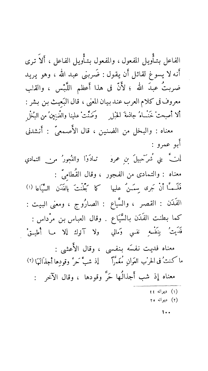 الفاعل بتأْويل المفعول، والمفعول بتأْويل الفاعل، أَلا ترَى أَنَّهُ لا يسوغ لقائل أنْ يقول: ضَربني عبد الله، وهو يريد ضربتُ عبد الله؛ لأنَّ في هذا أَعظم اللَّبْس، والقلب معروف في كلام العرب عند بيان المعنى، قال البَعيث بن بشر: