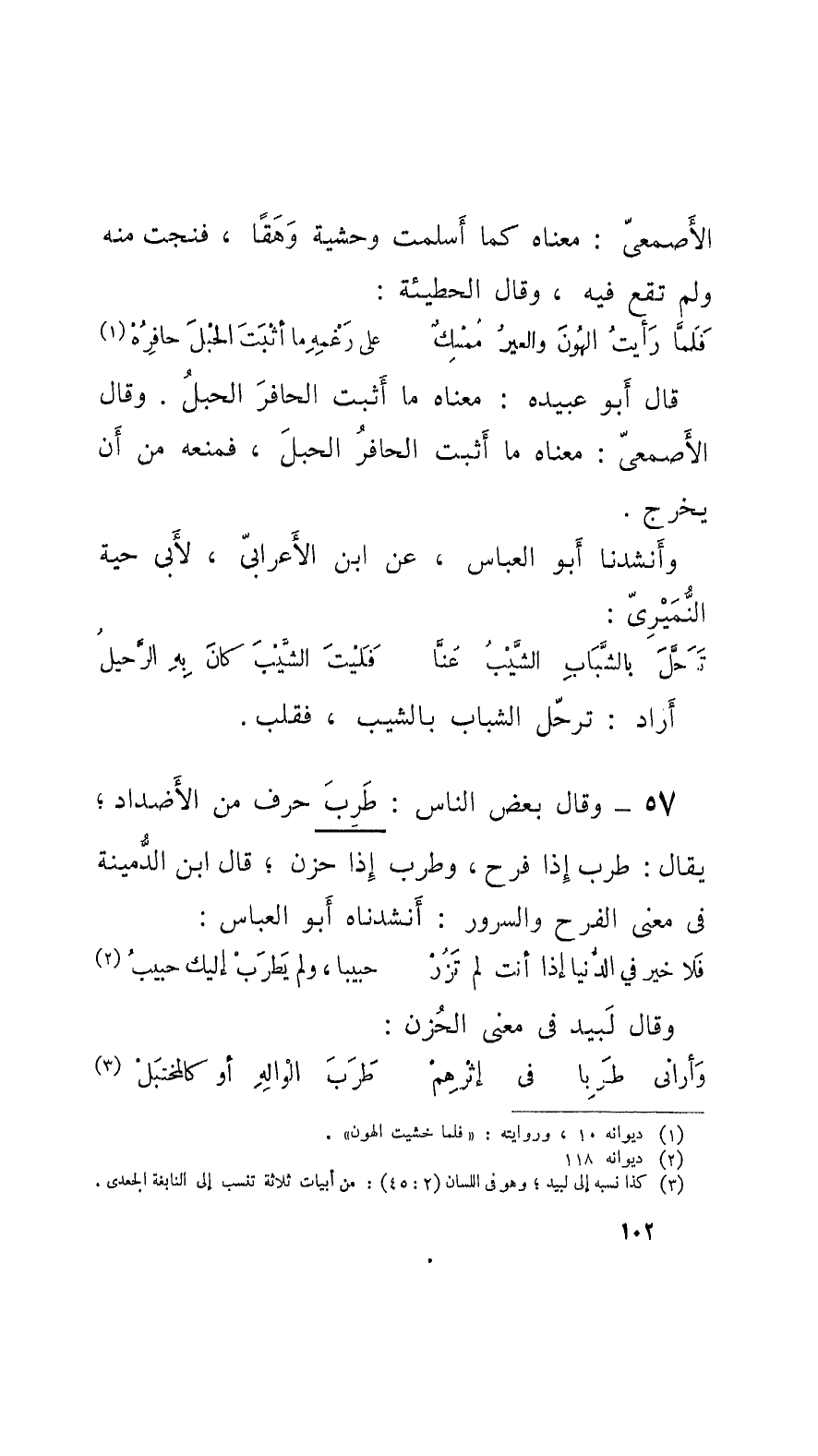 57 - وقالَ بعض النَّاس: طَرِبَ حرف من الأَضْداد؛ يقال: طرب إِذا فرح، وطرب إِذا حزن؛ قال ابن الدُّمينة في معنى الفرح والسُّرور: أَنشدناه أَبو العبَّاس: