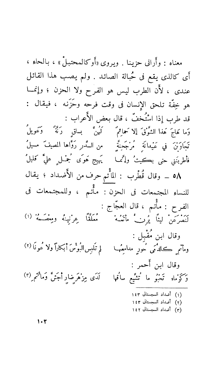 58 - وقالَ قُطْرب: المأْتم حرف من الأَضْداد؛ يقال للنِّساءِ المجتمعات في الحزن: مأْتم،