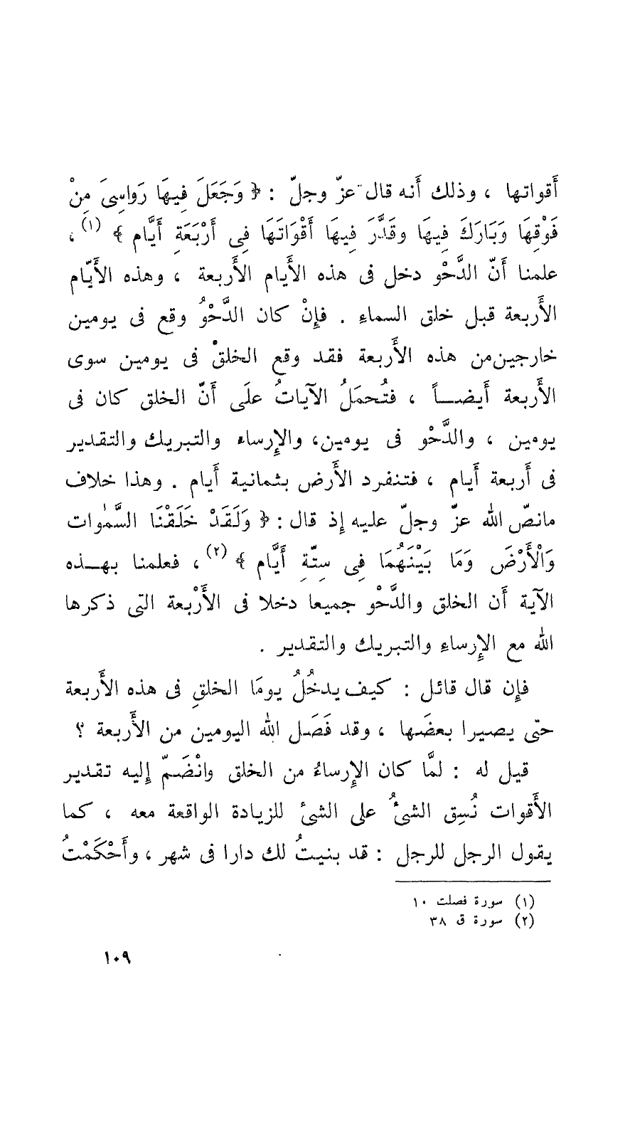 أَقواتها، وذلك أَنَّهُ قال عزَ وجلّ: وجَعَلَ فيها رَوَاسِيَ مِنْ فَوْقِها وبَارَكَ فيها وقَدَّرَ فيها أَقْوَاتَهَا في أَرْبَعَةِ أَيَّام، علمنا أَنَّ الدَّحْوَ دخل في هذه الأَيَّام الأَربعة، وهذه الأَيَّام الأَربعة قبل خلق السَّماء. فإِنْ كان الدَّحْوُ وقع في يومين خارجين من هذه الأَربعة فقد وقع الخلقْ في يومين سوى الأَربعة أَيْضاً، فتُحْمَلُ الآياتُ على أَنَّ الخلق كان في يومين، والدَّحْو في يومين، والإِرساء والتبريك والتقدير في أَربعة أَيام، فتنفرد الأَرض بثمانية أَيَّام. وهذا خلاف ما نصَّ عليه عزَ وجلّ إذْ قال: ولَقَدْ خَلَقْنَا السَّموات والأَرْضَ وَمَا بَيْنَهُمَا في سِتَّة أَيَّام، فعلمنا بهذه الآية أَنَّ الخلق والدَّحْو جميعاً دخلا في الأرْبعة التي ذكرها الله مع الإِرساء والتبريك والتقدير.