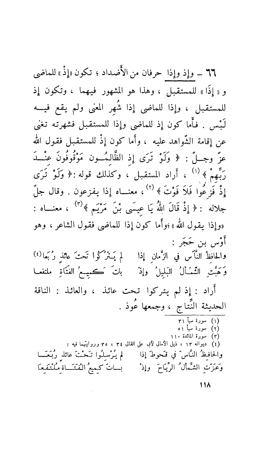 66 - وإذ وإذا حرفان من الأَضداد؛ تكون إذْ للماضي وإذا للمستقبل، وهذا هو المشهور فيهما، وتكون إذ للمستقبل، وإذا للماضي إِذا شُهِر المعنى ولم يقع فيه لَبْس. فأَما كون إذ للماضي وإذا للمستقبل فشهرته تغني عن إقامة الشّواهد عليه، وأَما كون إذْ للمستقبل فقول الله عزّ وجلّ: وَلَوْ تَرَى إذ الظَّالِمون مَوْقوفونَ عِنْدَ رَبِّهِمْ، أَرادَ المستقبل، وكذلك قوله: ولَوْ تَرَى إذْ فَزِعوا فَلا فَوْتَ، معناه إِذا يفزعون. وقالَ جلّ جلاله: إذْ قال الله يا عيسَى بنَ مَرْيَم، معناه: وإذا يقول الله؛ وأَما كون إِذا للماضي فقول الشَّاعِر، وهو أَوْس بن حَجَر:
