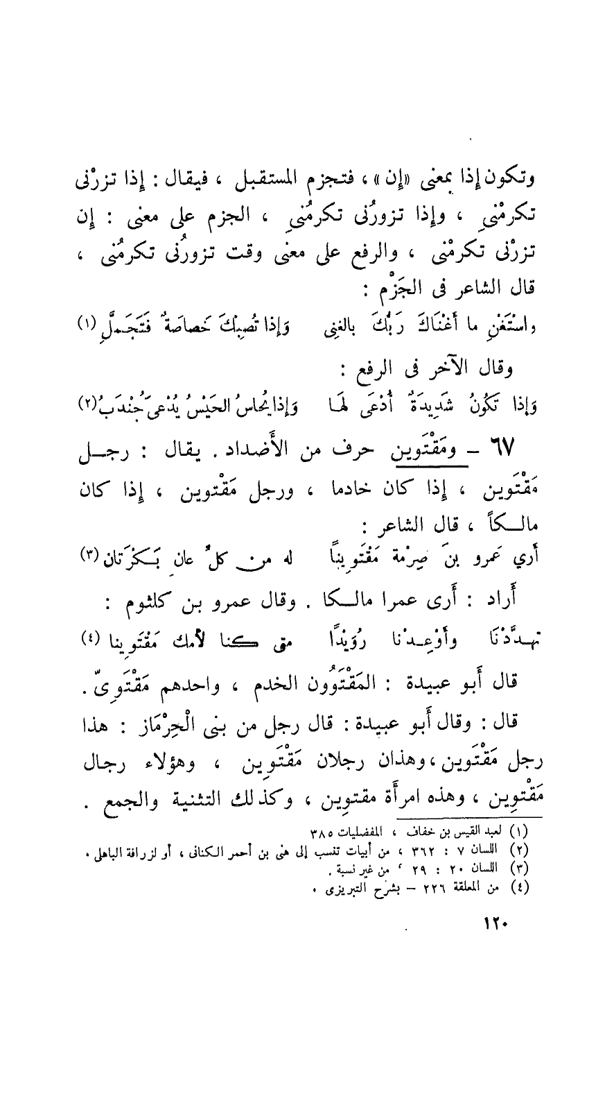 67 - ومَقْتَوين حرف من الأَضداد. يقال: رجل مَقْتَوين، إِذا كان خادماً، ورَجُلٌ مَقْتوين، إِذا كان مالكاً، قال الشَّاعِر: