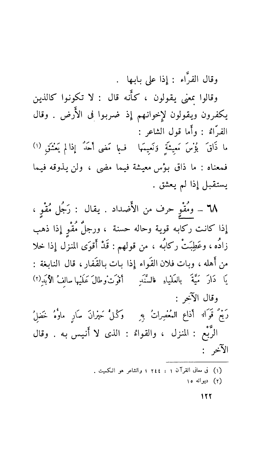 68 - ومُقْوٍ حرف من الأَضداد. يقال: رَجُل مُقْوٍ، إِذا كانت ركابه قوية وحاله حسنة، ورَجُلٌ مُقْوٍ إِذا ذهب زادُه، وعَطِبَتْ ركابُه، من قولهم: قد أَقوَى المنزل إِذا خلا من أَهله، وبات فلان القَواء إِذا بات بالقَفار، قال النَّابِغَة: