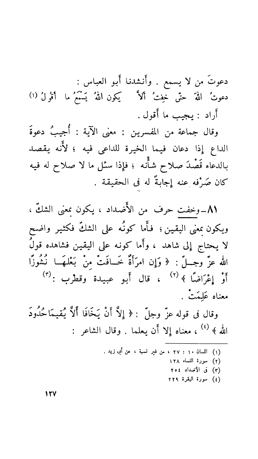 81 - وخفت حرف من الأَضداد، يكون بمَعْنَى الشكّ، ويكون بمَعْنَى اليقين؛ فأَما كونُه على الشكّ فكثير واضح لا يحتاج إِلى شاهد، وأَما كونه على اليقين فشاهده قولُ الله عزَ وجلّ: وإن امرَأَةً خافَتْ من بَعْلها نُشوزاً أَوْ إعْراضاً، قال أَبو عُبيدة وقطرب: معناه عَلِمَتْ.