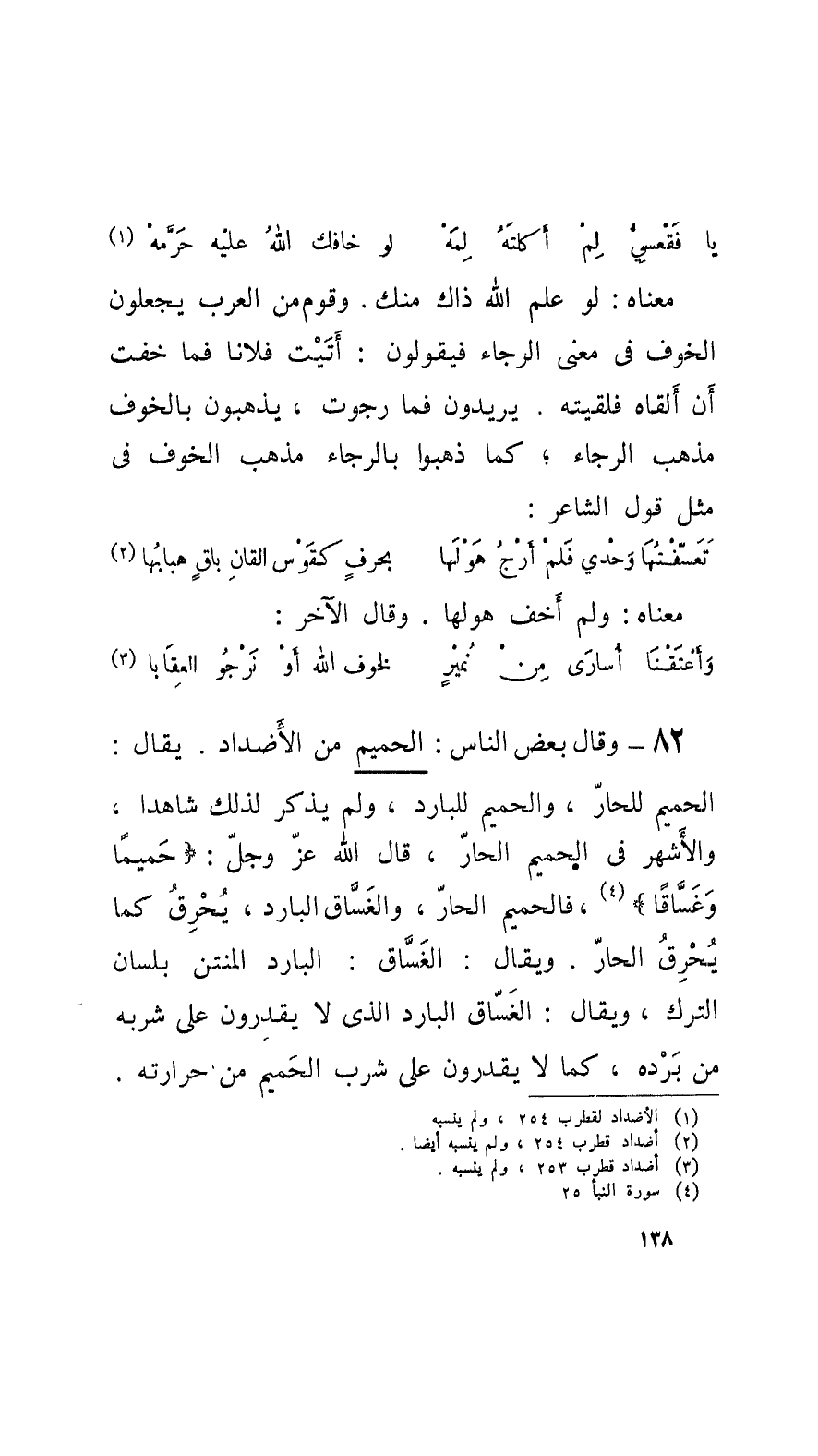 82 - وقالَ بعض النَّاس: الحميم من الأَضداد. يقال: الحميم للحارّ، والحميم للبارد، ولم يذكر لذلك شاهداً، والأَشهر في الحميم الحارّ، قال الله عزَ وجلّ: حَميماً وغَسَّاقاً، فالحميم الحارّ، والغَسَّاق البارد، يُحْرِقُ كما يُحْرِقُ الحارّ. ويقال: الغَسَّاق: البارد المنتن بلسان الترك، ويقال: الغَسَّاق البارد الَّذي لا يقدرون على شربه من بَرْده، كما لا يقدرون على شرب الحَميم من حرارته.