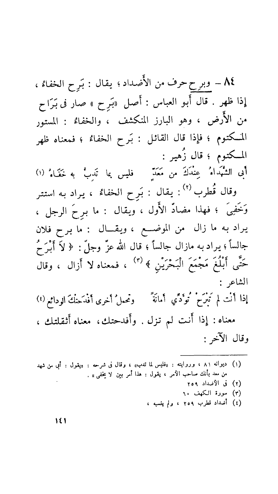 84 - وبرِح حرف من الأَضداد؛ يقال: بَرِح الخفاءُ، إِذا ظهر. قال أَبو العباس: أَصل بَرِح صار في بَرَاح من الأَرض، وهو البارز المنكشف، والخفاءُ المستور المكتوم؛ فإذا قال القائل: بَرح الخفاءُ؛ فمعناه ظهر المكتوم؛ قال زُهير: