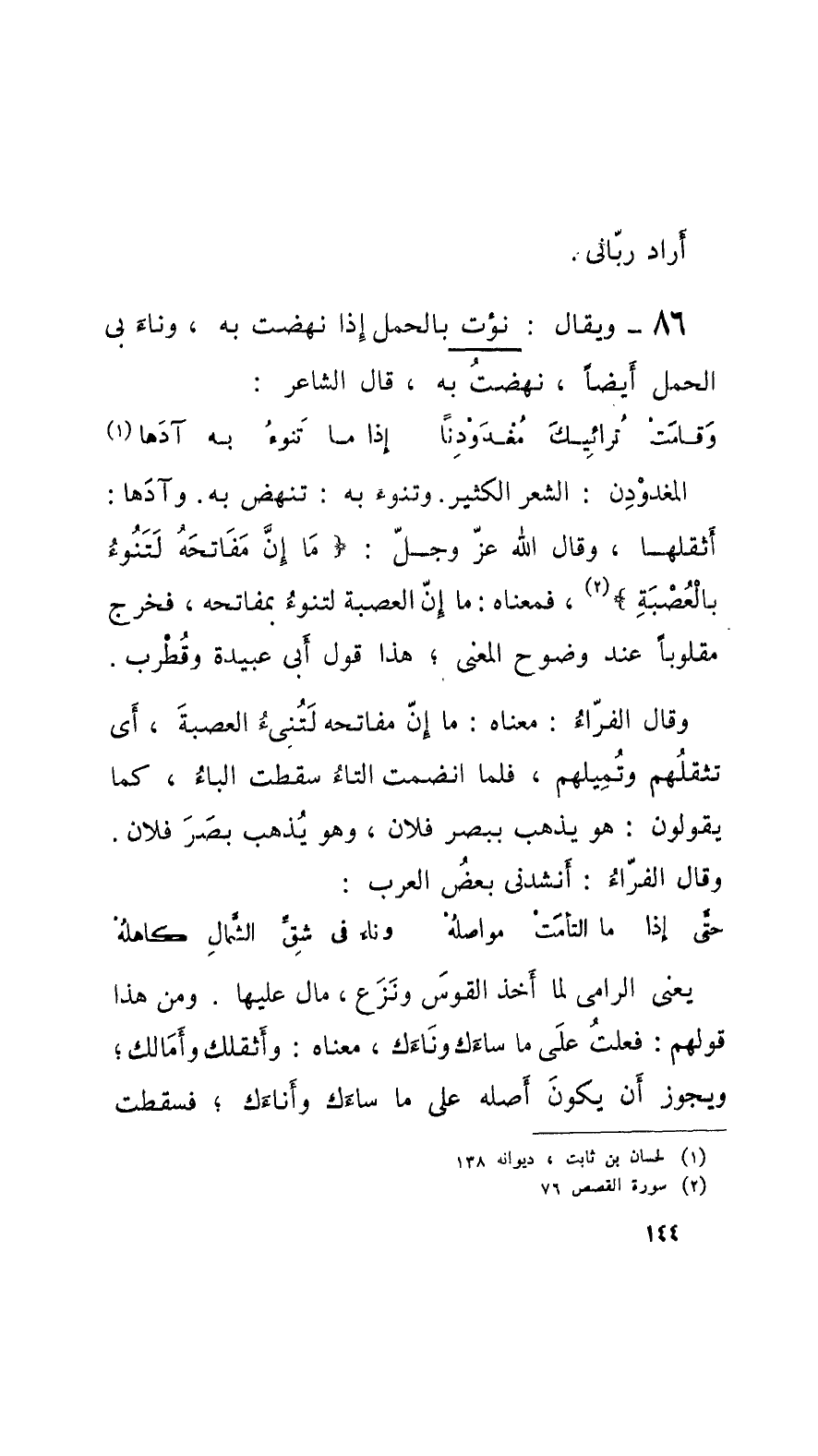 86 - ويقال: نؤت بالحمل إِذا نهضت به، وناءَ بي الحمل أَيْضاً، نهضتُ به، قال الشَّاعِر: