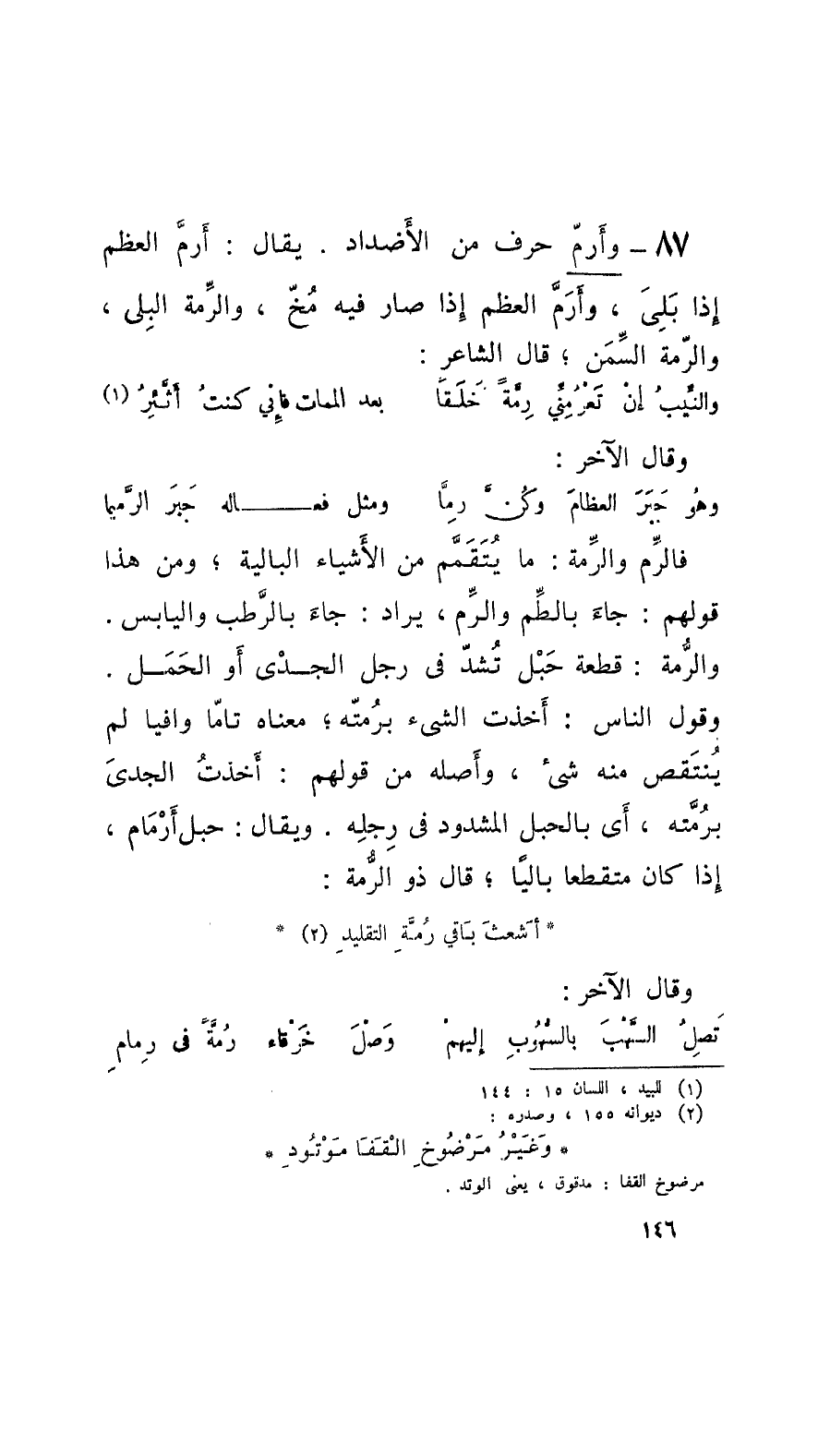 87 - وأَرمّ حرف من الأَضداد. يقال: أَرمَّ العظم إِذا بَلِيَ، وأَرَمَّ العظم إِذا صار فيه مُخّ، والرِّمة البِلى، والرّمة السِّمَن؛ قال الشَّاعِر: