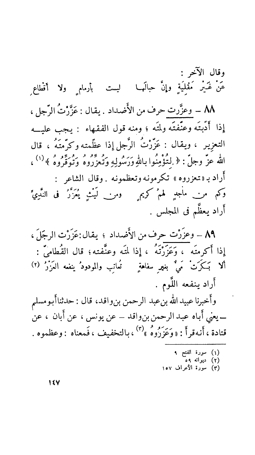 89 - وعزَرْت حرف من الأَضداد؛ يقال: عَزَرْت الرَّجُلَ، إِذا أَكرمتَه، وعَزَرْتَهُ، إِذا لمتَه وعنَّفته؛ قال القُطاميّ: