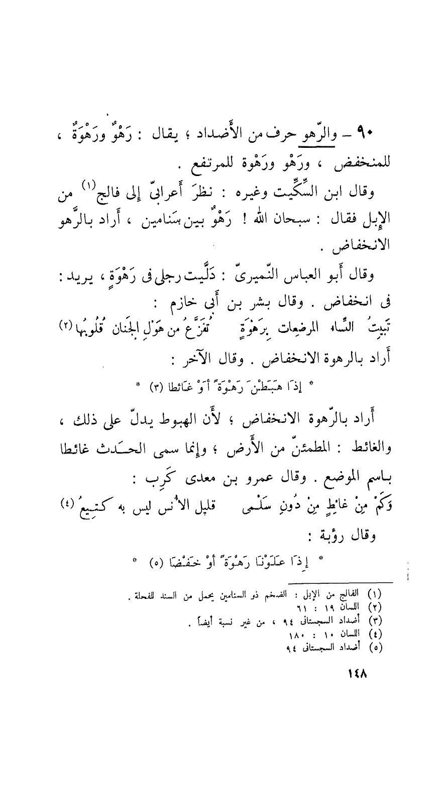 90 - والرّهو حرف من الأَضداد؛ يقال: رَهْوٌ ورَهْوَةٌ، للمنخفض، ورَهْو ورَهْوة للمرتفع. وقالَ ابن السِّكِّيتِ وغيره: نظرَ أَعرابيّ إِلى فالج من الإِبِل فقال: سبحان الله! رَهْوٌ بين سَنامين، أَراد بالرَّهو الانخفاض.