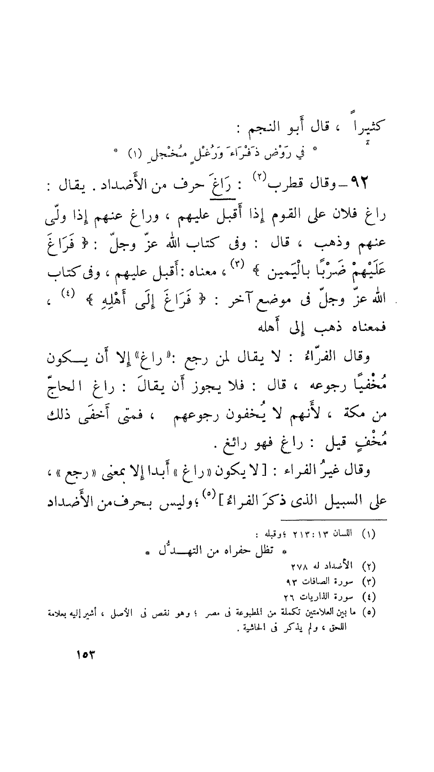 92 - وقالَ قُطْرب: رَاغَ حرف من الأَضْداد. يقال: راغ فلان على القوم إِذا أَقبل عليهم، وراغ عنهم إِذا ولَّى عنهم وذهب، قال: وفي كتاب الله عزَ وجلّ: فَرَاغَ عَلَيْهمْ ضَرْباً باليَمين، معناه: أَقبل عليهم، وفي كتاب الله عزَ وجلّ في موضع آخر: فَرَاغَ إِلى أَهْلِهِ، فمعناه ذهب إِلى أَهله. وقالَ الفَرَّاءُ: لا يقال لمن رجع: راغ إِلاَّ أَن يكون مُخْفياً رجوعه، قال: فلا يجوز أَن يقالَ: راغ الحاجّ من مكَّة، لأَنَّهم لا يُخفون رجوعهم، فمتى أَخفى ذلك مُخْفٍ قيل: راغ فهو رائغ. وقالَ غير الفَرَّاء: لا يكون راغ أَبداً إِلاَّ بمَعْنَى رجع، على السَّبيل الَّذي ذكرَ الفَرَّاء؛ وليس بحرف من الأَضْداد
