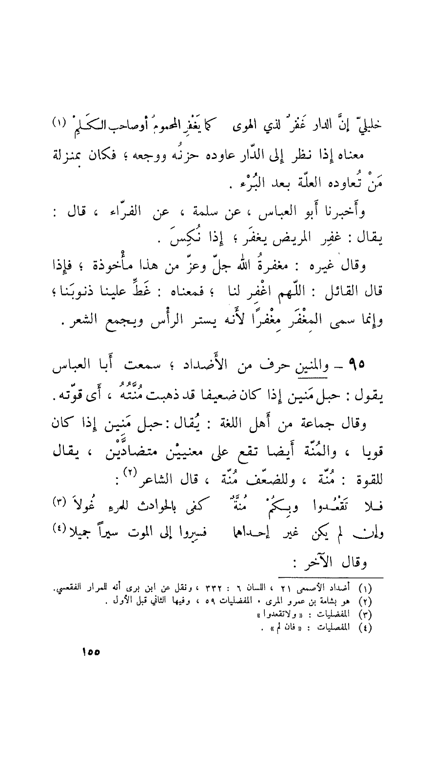95 - والمَنين حرف من الأَضْداد؛ سمعت أَبا العباس يقول: حبل مَنين إِذا كان ضعيفاً قد ذهبت مُنَّتُهُ، أَي قوَّته.