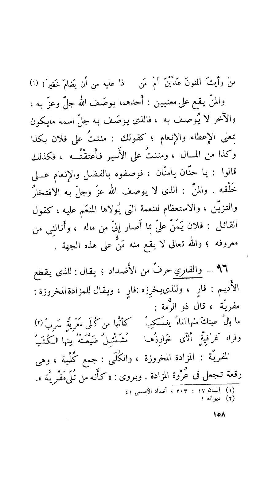 والمنّ يقع على معنيين: أَحدهما يوصَف الله عزَ وجلّ به، والآخر لا يوصَف به، فالَّذي يوصَف به جلَّ اسمه ما يكون بمَعْنَى الإِعطاء والإِنعام؛ كقولك: مننتُ على فلان بكذا وكذا من المال، ومننتُ على الأَسير فأَعتقْتُه، فكذلك قالوا: يا حنَّان يا منَّان، فوصفوه بالفضل والإِنعام على خَلْقه. والمنّ: الَّذي لا يوصَف الله عزَ وجلّ به الافتخارُ والتزيّن، والاستعظام للنعمة الَّتي يُولاها المُنعَم عليه، كقول القائل: فلان يَمُنّ عليَّ بما أَصار إِليَّ من ماله، وأَنالني من معروفه؛ والله تعالى لا يقع منه مَنٌّ على هذه الجهة.