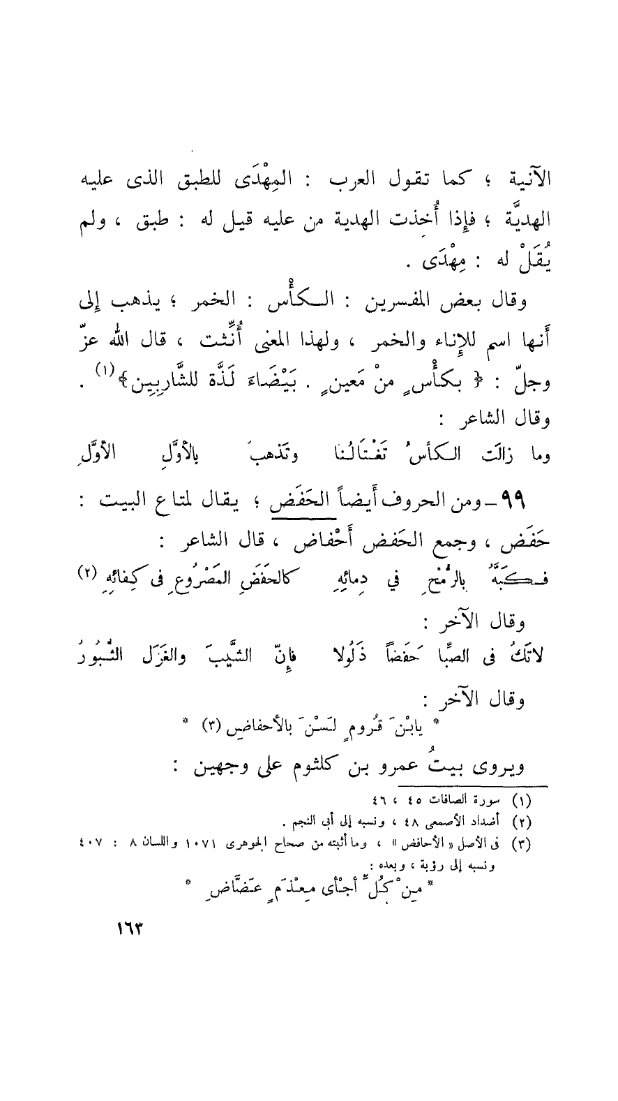 99 - ومن الحروف أَيْضاً الحَفَض؛ يقال لمتاع البيت: حَفَض، وجمع الحَفَض أَحْفاض، قال الشَّاعر: