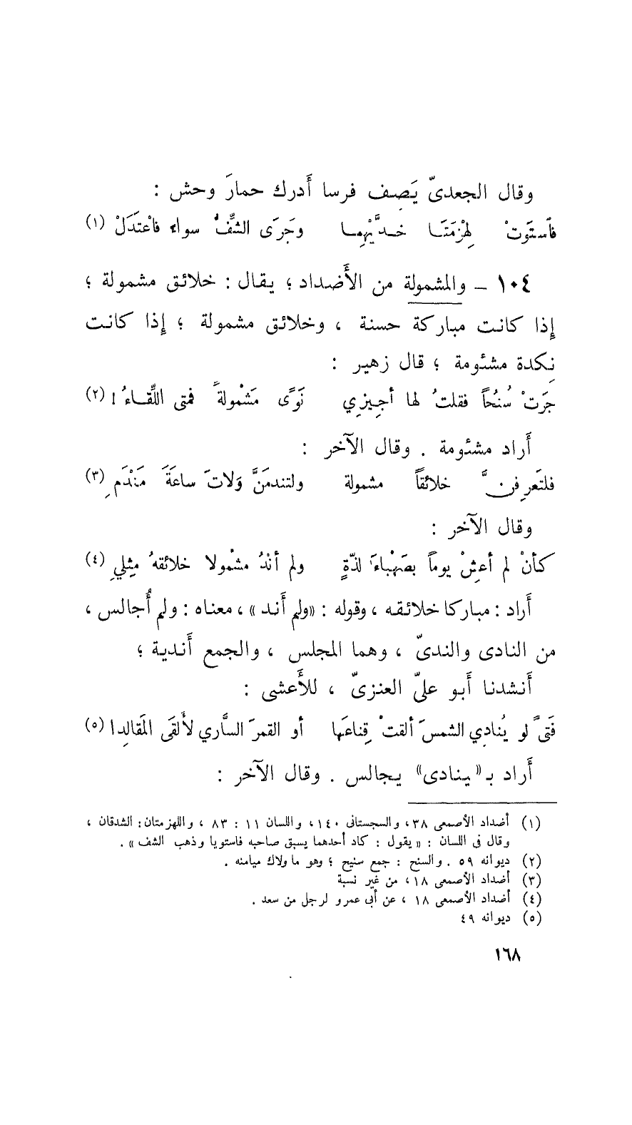104 - والمشمولة من الأَضْداد؛ يقال: خلائق مشمولة؛ إِذا كانت مباركة حسنة، وخلائق مشمولة؛ إِذا كانت نِكدة مشئومة؛ قال زهير: