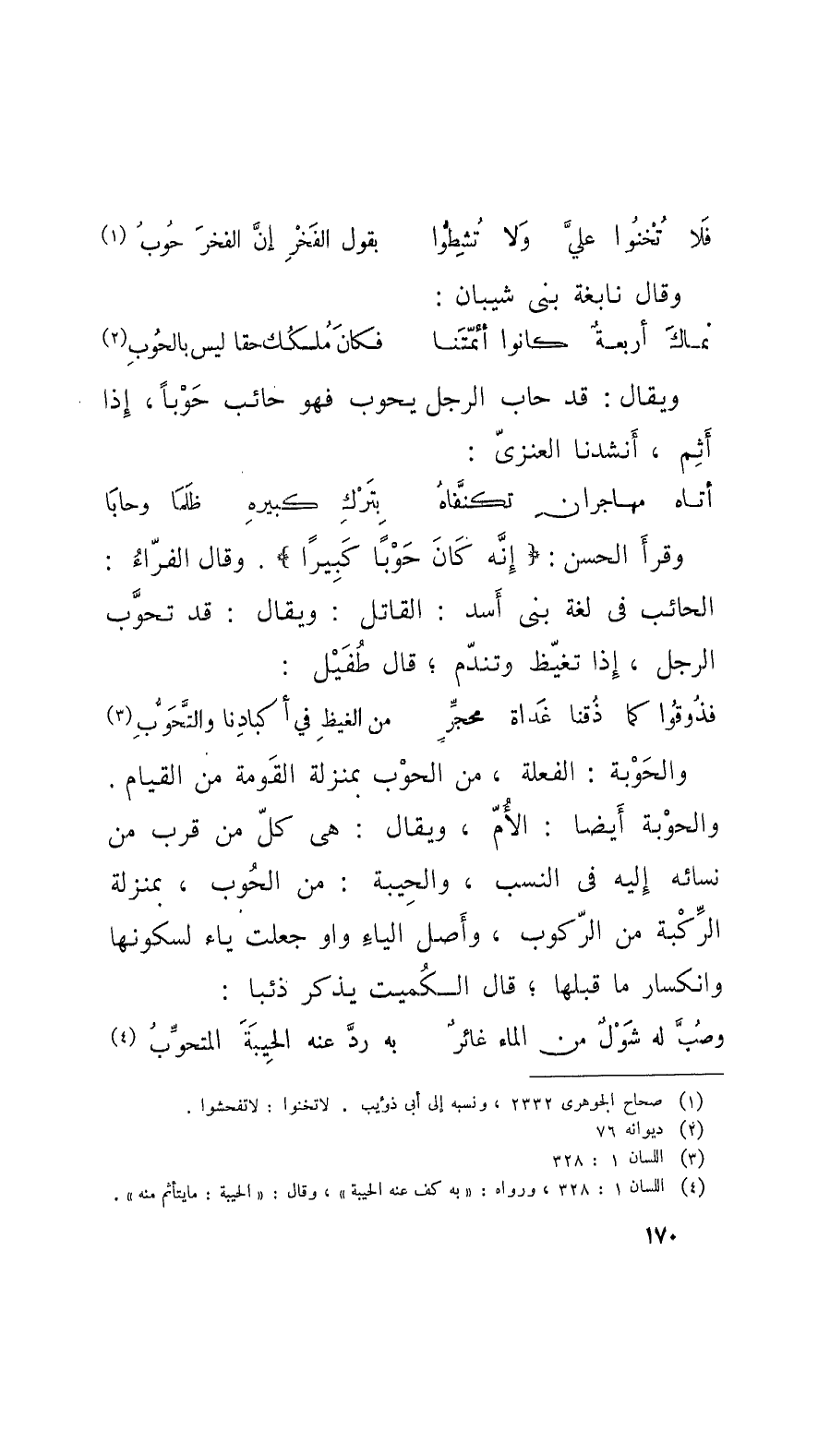 وقرأَ الحسن: إِنَّهُ كان حَوْباً كَبيراً. وقالَ الفَرَّاءُ: الحائب في لغة بَنِي أَسد: القاتل. ويقال: قد تحوَّب الرجل، إِذا تغيَّظ وتندَّم؛ قال طُفَيْل: