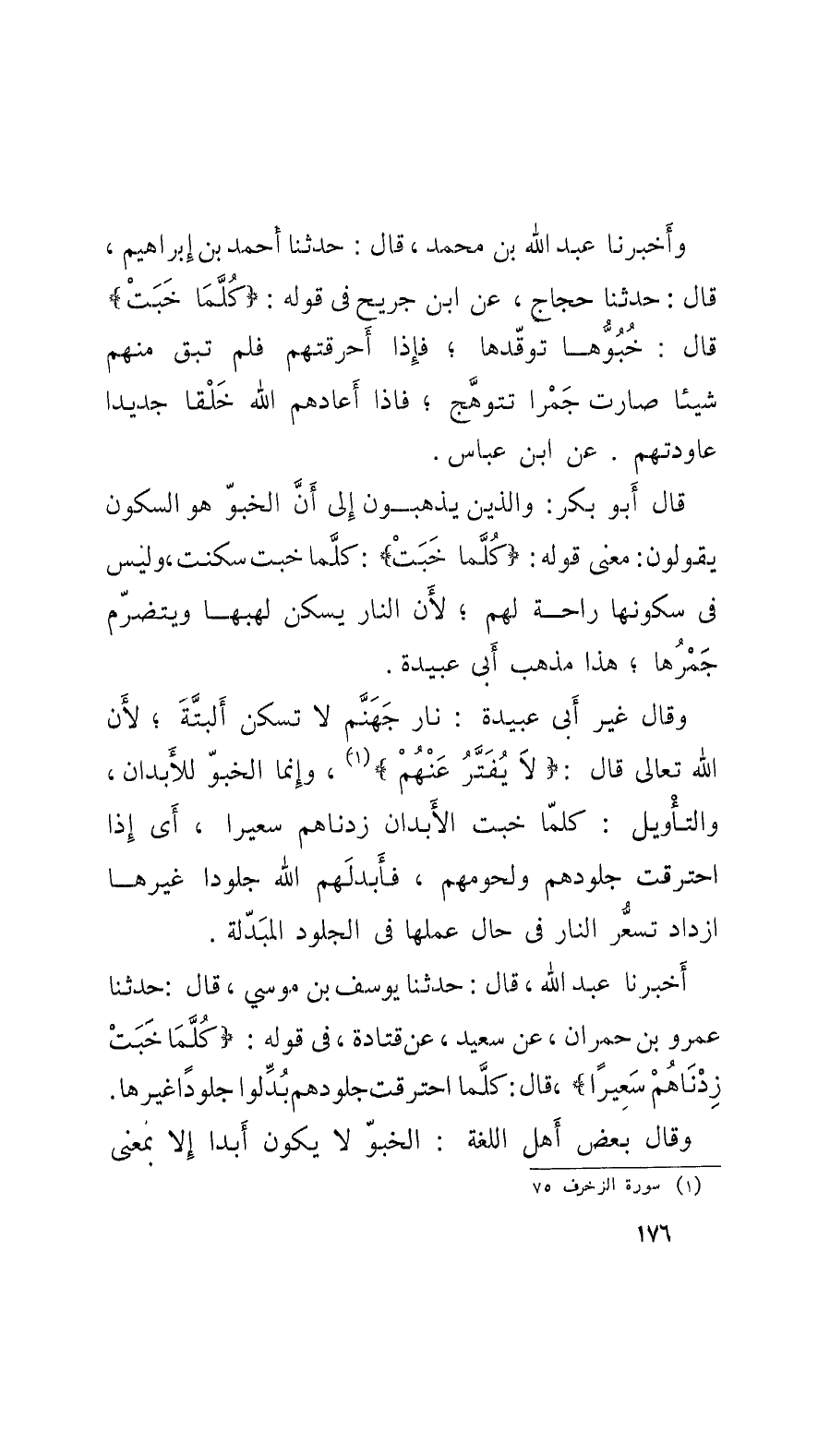 وأَخبرنا عبد الله بن محمد، قال: حدَّثنا أَحمد بن إِبراهيم، قال: حدَّثنا حجاج، عن ابن جريح في قوله: كُلَّمَا خَبَتْ قال: خُبُؤُّها توقُّدها؛ فإِذا أَحرقتهم فلم تبق منهم شيئاً صارت جَمْراً تتوهَّج، فإِذا أَعادهم الله خَلْقاً جديداً عاودتهم. عن ابن عباس.