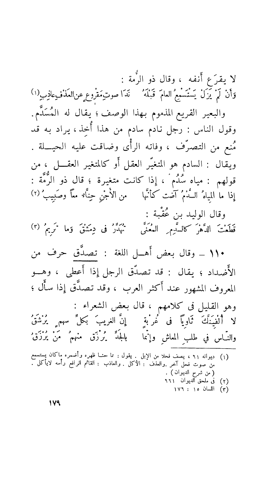 110 - وقالَ بعض أَهل اللُّغة: تصدَّق حرف من الأَضداد؛ يقال: قد تصدّق الرَّجُل إِذا أَعطى، وهو المعروف المشهور عند أَكثر العرب، وقد تصدَّق إِذا سأَل؛ وهو القليل في كلامهم، قال بعض الشعراء: