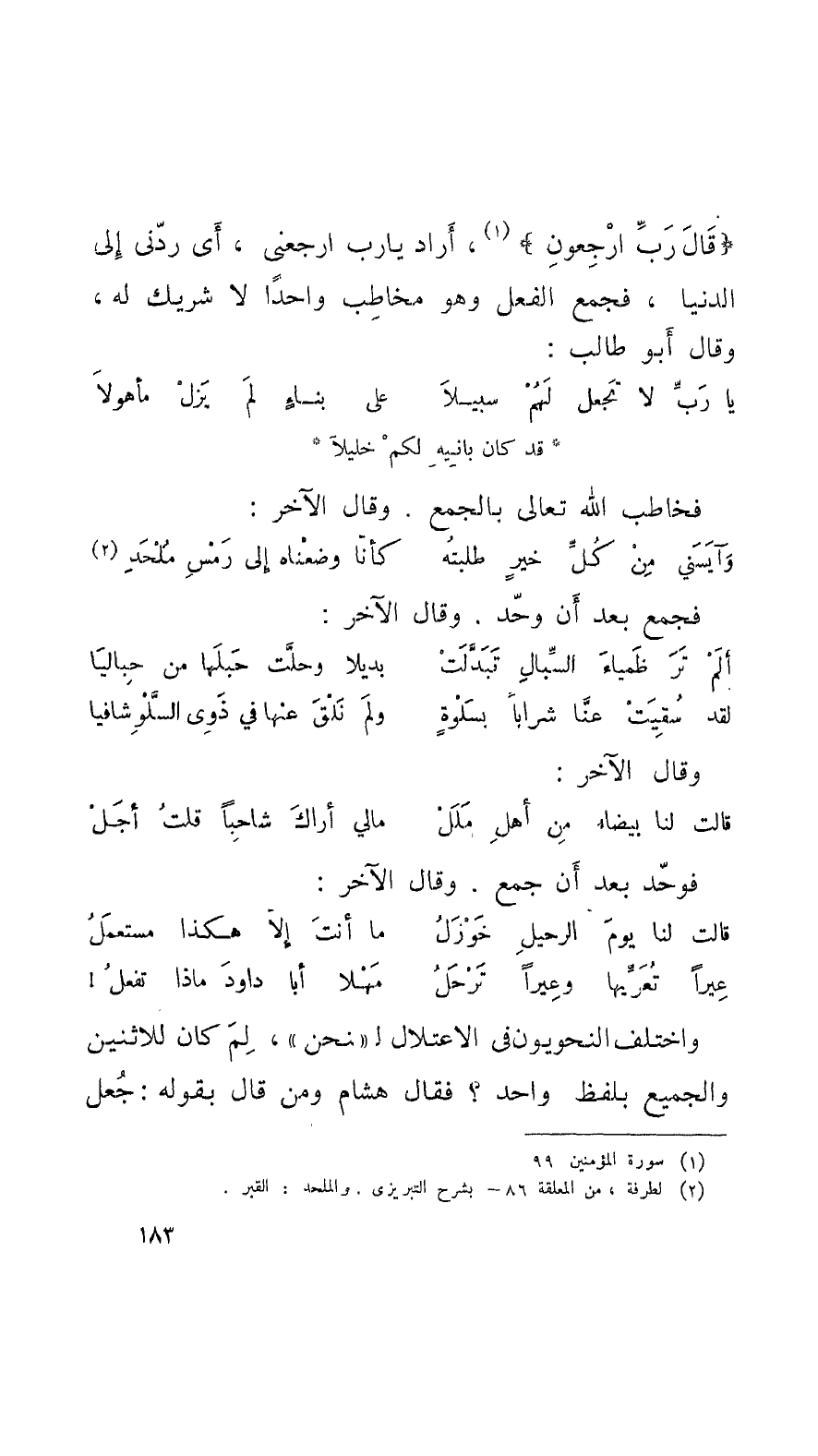 قال رَبِّ ارْجِعونِ، أَراد يا رب ارجعني، أَي ردّني إِلى الدنيا، فجمع الفعل وهو مخاطِب واحداً لا شريك له، وقالَ أَبو طالب: