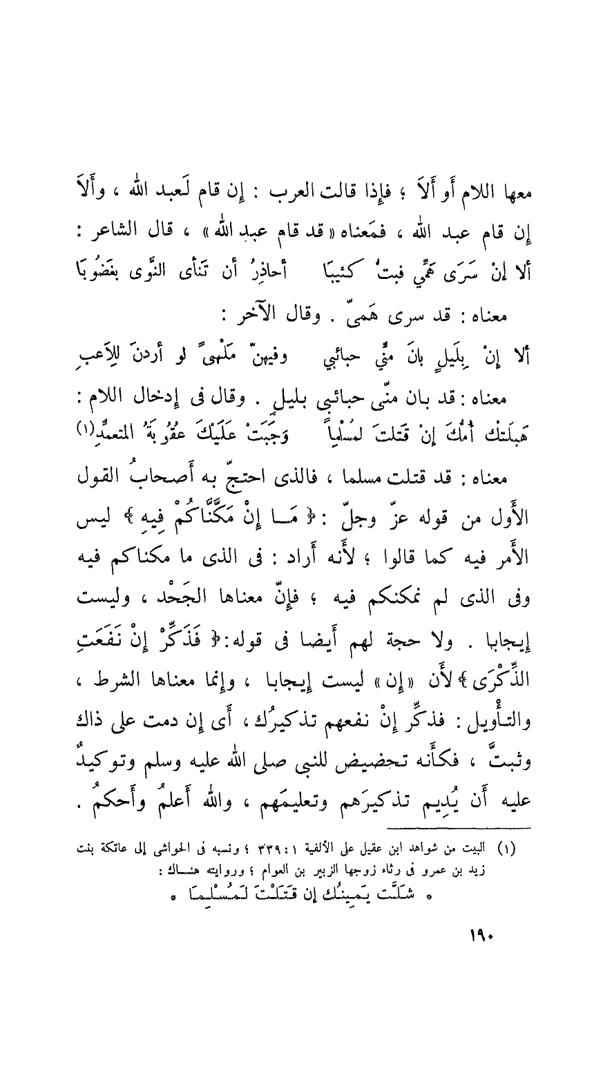 معناه: قد قتلت مسلماً، فالذي احتجّ به أَصحابُ القول الأَول من قوله عزَ وجلّ: ما إِنْ مَكَّنَّاكُمْ فيه لَيْسَ الأَمْر فيه كما قالوا؛ لأَنَّه أَراد: في الَّذي ما مكناكم فيه وفي الَّذي لم نمكنكم فيه؛ فإِنَّ معناها الجَحْد، وليست إيجاباً. ولا حجة لهم أَيْضاً في قوله: فَذَكِّرْ إنْ نَفَعَتْ الذِّكْرى لأَنَّ إِنْ لَيْسَتْ إيجاباً، وإنما معناها الشرط، والتأْويل: فذكِّر إنْ نفعهم تذكيرُك، أَي إن دمت على ذاك وثبتَّ، فكأنه تحضيض للنبي صَلّى اللهُ عليه وسَلّم وتوكيدٌ عليه أَن يُديم تذكيرَهم وتعليمَهم، والله أَعلمُ وأَحكمُ.