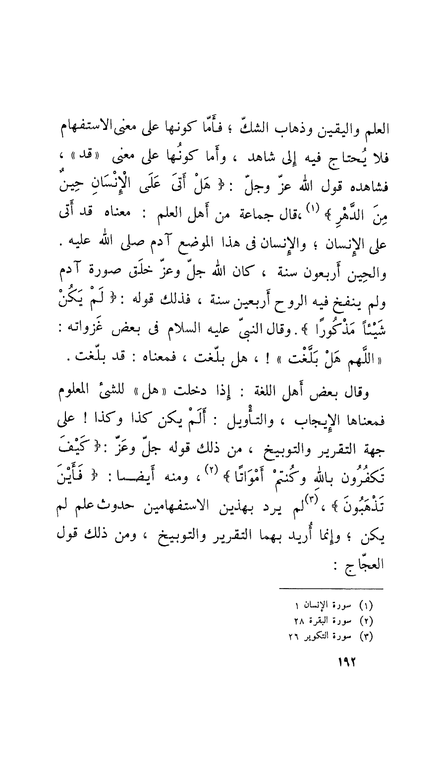 العلم واليقين وذهاب الشكّ؛ فأَمّا كونها على معنى الاستفهام فلا يُحتاج فيه إِلى شاهد، وأَما كونُها على معنى قد، فشاهده قول الله عزَ وجلّ: هَلْ أَتَى على الإنسانِ حينٌ منَ الدَّهْرِ، قال جماعة من أَهل العلم: معناه قد أَتى على الإنسان؛ والإنسان في هذا الموضع آدم صَلّى اللهُ عليه. والحين أَربعون سنة، كان الله عزَ وجلّ: خلَق صورة آدم ولم ينفخ فيه الروح أَربعين سنة، فذلك قوله: لَمْ يَكُنْ شَيْئاً مَذْكوراً. وقالَ النَّبِيّ عليه السلام في بعض غزواته: اللَّهم هَلْ بَلَّغْت!، هل بلَّغت، فمعناه: قد