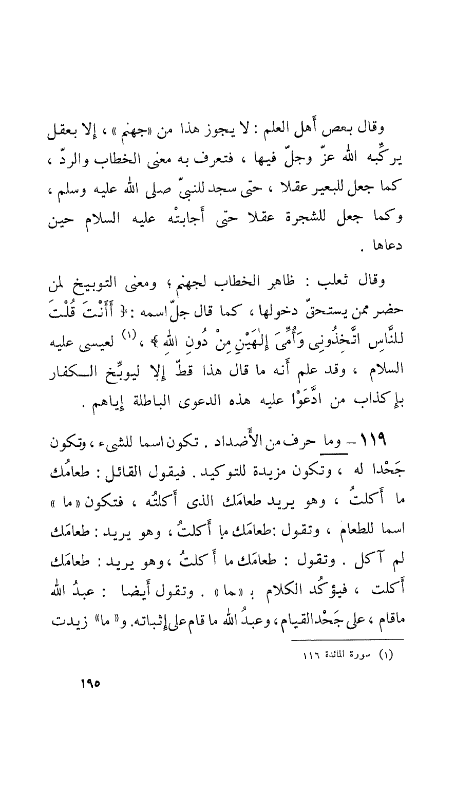 119 - وما حرف من الأَضداد. تكون اسماً للشيء، وتكون جَحْداً له، وتكون مزيدة