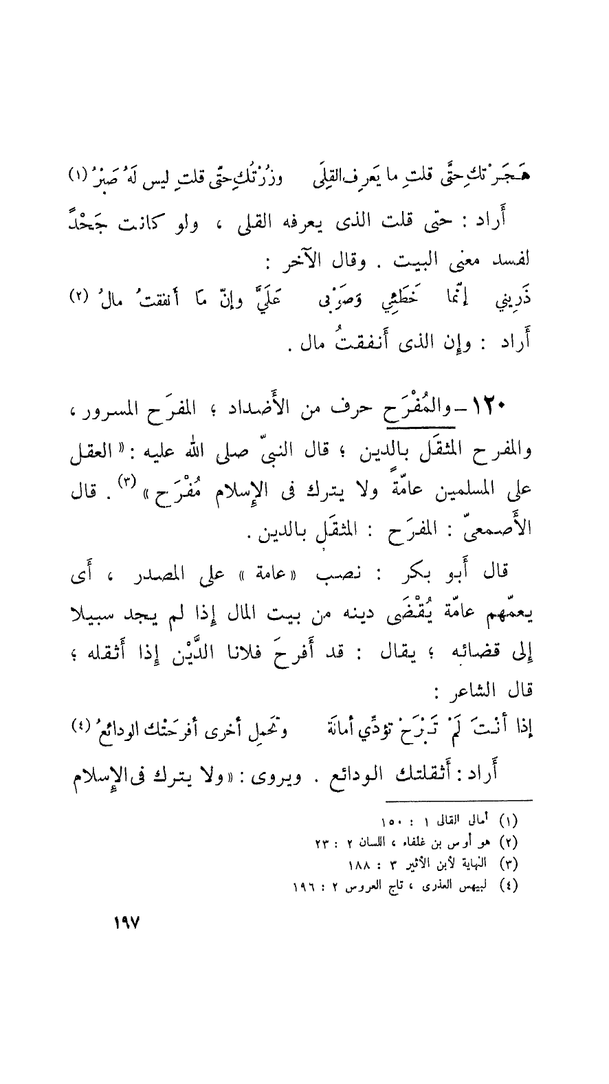 120 - والمُفْرَح حرف من الأَضداد؛ المفرَح المسرور، والمفرح المثقَل بالدين؛ قال النَّبِيّ