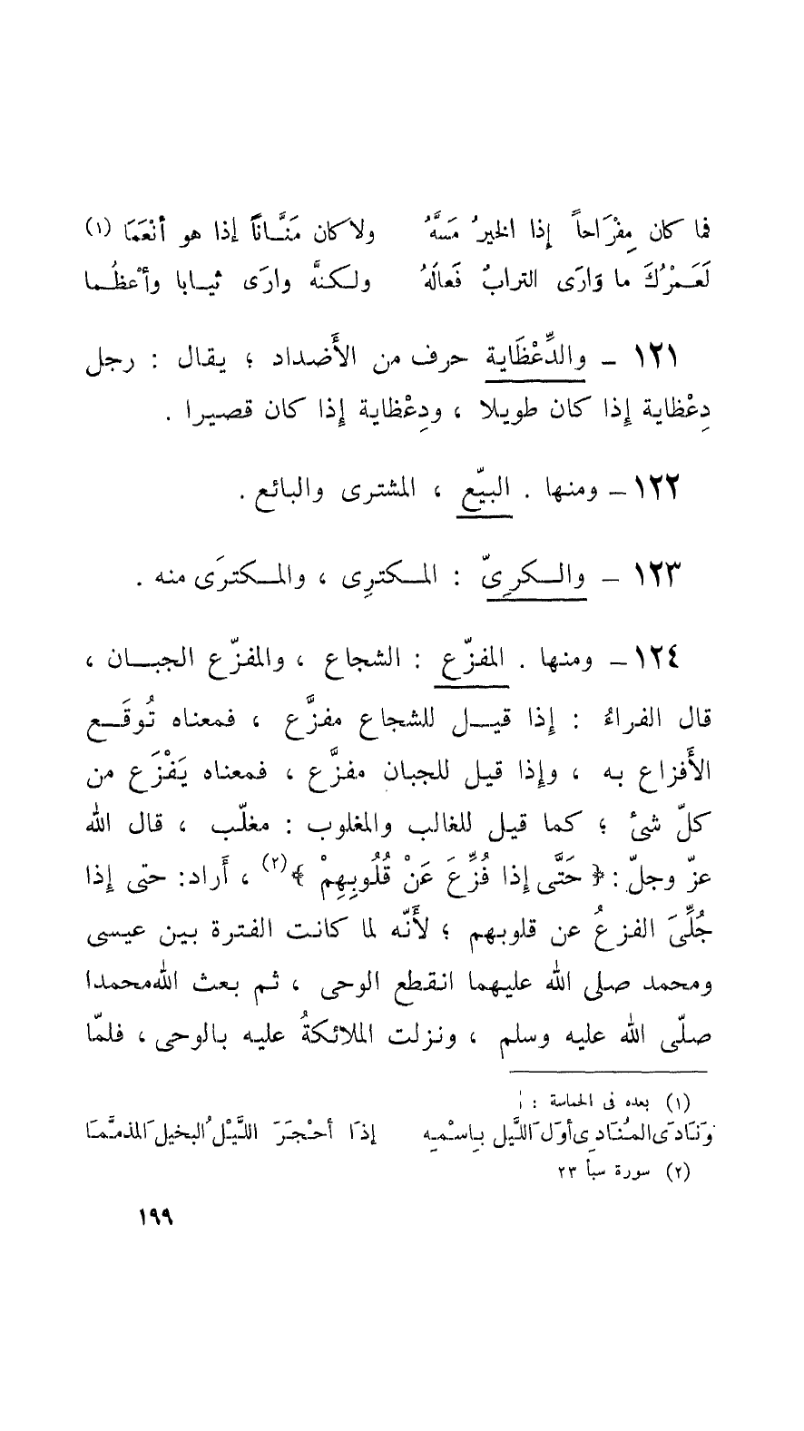 124 - ومنها. المفزّع: الشجاع، والمفزّع الجبان، قال الفَرَّاءُ: إِذا قيل للجبان مفزَّع، فمعناه تُوقَع الأَفزاع به، وإذا قيل للجبان مفزَّع، فمعناه يَفْزَع من كلّ شيء؛ كما قيل للغالب والمغلوب: مغلّب، قال الله عزَ وجلّ: حتَّى إِذا فُزِّعَ عن قُلوبِهِمْ، أَراد: حتَّى إِذا جُلِّيَ الفزعُ عن قلوبهم؛ لأَنَّه لما كانت الفترة بين عيسى ومحمد صلى الله عليهما انقطع الوحي، ثمَّ بعث الله محمداً صَلّى اللهُ عليه وسَلّم، ونزلت الملائكةُ عليه بالوحي، فلمّا