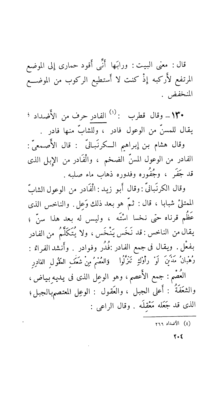 130 - وقالَ قُطْرب: الفادر حرف من الأَضداد؛ يقال للمسنّ من الوعول فادر، وللشابّ منها فادر. وقالَ هشام بن إبراهيم الكرنَبانيّ: قال الأَصْمَعِيّ: الفادر من الوعول المسنّ الضخم، والْفَادر من الإِبِل الَّذي قد جَفَر، وجُفوره وفدوره ذهاب ماء صلبه.
