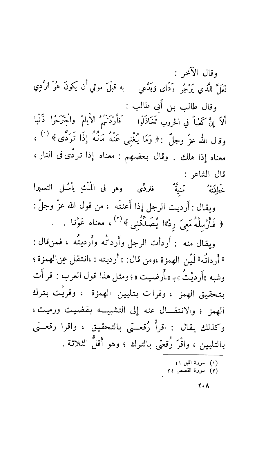 ويقال: أَرديت الرَّجُل إِذا أَعنتَه، من قول الله عزَ وجلّ: فَأَرْسِلْهُ مَعيَ رِدْءاً يُصَدِّقُني، معناه عَوْناً. ويقال منه: أَردأت الرَّجُل وأَرداتُه وأَرديتُه، فمن قال: أَرداتُه لَيّن الهمزة، ومن قال: أَرديته، انتقل عن الهمزة؛ وشبه أَرديْتُ بأَرضيت؛ ومثل هذا قول العرب: قرأَت بتحقيق الهمز، وقرات بتليين الهمزة، وقريْت بترك الهمز؛ والانتقال عنه إِلى التشبيه بقضيت ورميت، وكذلك يقال: اقرأْ رُقعتي بالتحقيق، واقرا رقعتي بالتليين، واقْرَ رُقعتي بالترك؛ وهو أَقلُّ الثلاثة.