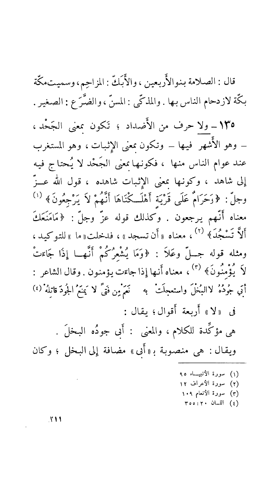 135 - ولا حرف من الأَضداد؛ تكون بمَعْنَى الجَحْد، - وهو الأَشهر فيها - وتكون بمَعْنَى الإثبات، وهو المستغرب عند عوام النَّاس منها، فكونها بمَعْنَى الجَحْد لا يُحتاج فيه إِلى شاهد، وكونها بمَعْنَى الإثبات شاهده، قول الله عزَ وجلّ: وَحَرامٌ على قَرْيَةٍ أَهْلَكْناها أَنَّهُمْ لا يَرْجِعون معناه أَنّهم يرجعون. وكذلك قوله عزَ وجلّ: ما مَنَعَكَ ألاَّ تَسْجُدَ، معناه أَن تسجد، فدخلت ما للتوكيد، ومثله قوله جلّ وعَلا: وما يُشْعِرُكُمْ أَنَّها إِذا جاءتْ لا يُؤْمِنون، معناه أَنها إِذا جاءت يؤمنون. وقالَ الشَّاعِر: