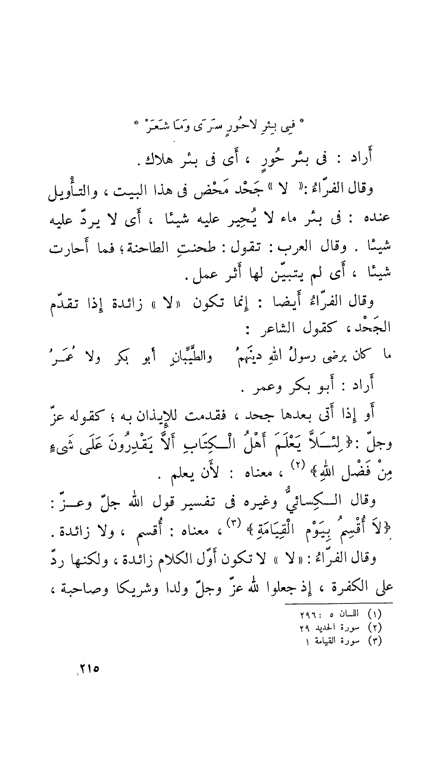 وقالَ الكِسَائِيُّ وغيره في تفسير قول الله عزَ وجلّ: لا أُقْسِمُ بيَوْم القِيَامَةِ، معناه: أُقسم، ولا زائدة.