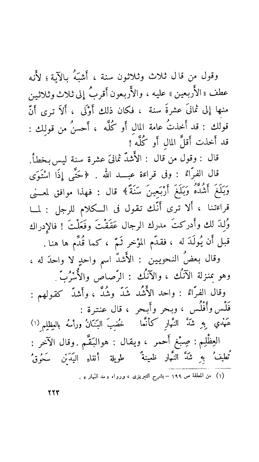 وقول من قال ثلاث وثلاثون سنة، أَشبَه بالآية؛ لأَنَّه عطف الأَربعين عليه، والأَربعون أَقربُ إِلى ثلاث وثلاثين منها إِلى ثمانيَ عشرة سنة؛ فكان ذلك أَوْلَى، أَلاَ ترى أَنَّ قولك: قد أَخذتُ عامة المال أَو كُلَّه، أَحسنُ من قولِك: قد أَخذتُ أَقلَّ المالِ أَو كُلَّه! قال: وقول من قال: الأَشدّ ثمانيَ عشرة سنة لَيْسَ بخطأ.