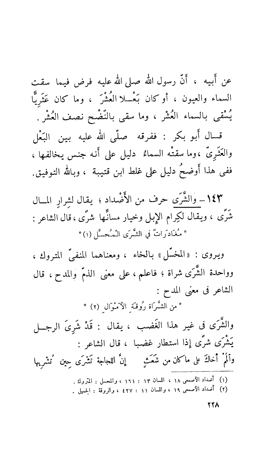 143 - والشَّرَى حرف من الأَضْداد؛ يقال لشِرارِ المال شَرًى، ويقال لكرام الإِبل وخيار