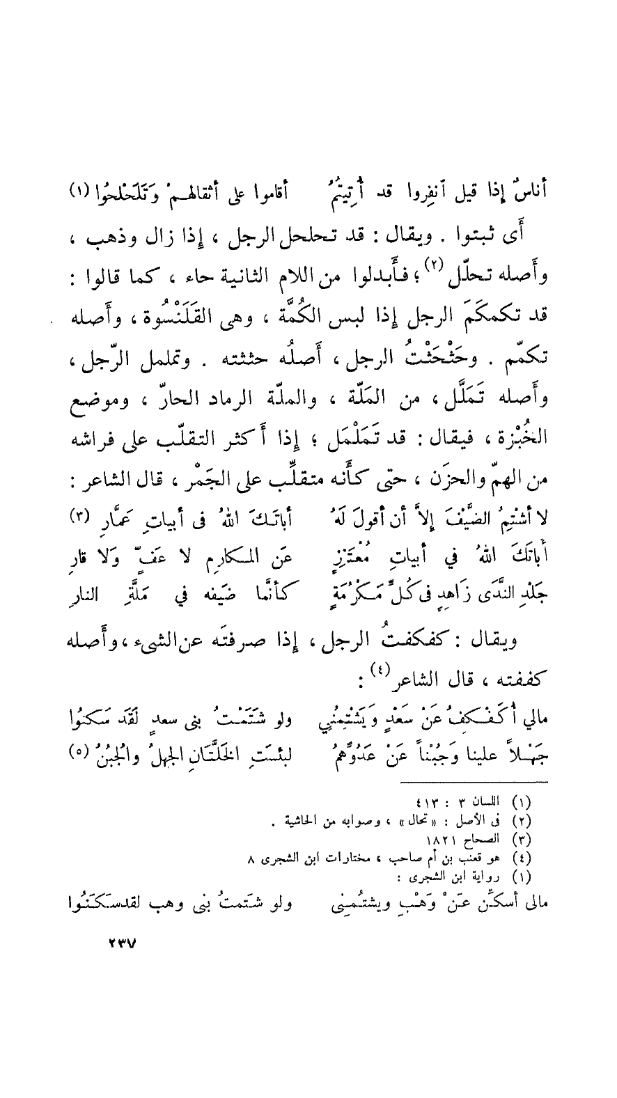 أَي ثبتوا. ويقال: قد تحلحل الرجل، إِذا زال وذهب، وأَصله تحلّل؛ فأَبدلوا من اللام الثانية حاء، كما قالوا: قد تكمكَمَ الرَّجُل إِذا لبس الكُمَّة، وهي القَلَنْسُوة، وأَصله تكمّم. وحَثْحَثْتُ الرَّجُل، أَصلُه حثثته. وتململ الرَّجُل، وأَصله تَمَلَّل، من المَلّة، والملّة الرماد الحارّ، وموضع الخُبْزة، فيقال: قد تَمَلْمَل؛ إِذا أَكثر التقلّب على فراشه من الهمّ والحزَن، حتَّى كَأَنَّهُ متقلِّب على الجَمْر، قال الشَّاعِر: