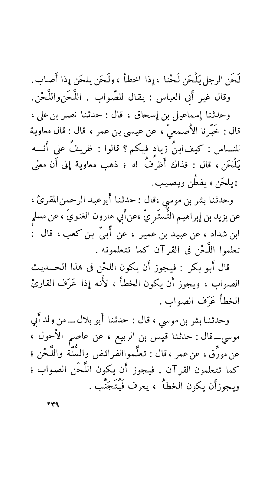 وحدثنا بشر بن موسى، قال: حدَّثنا أَبو بلال - من ولد أَبي موسى - قال: حدَّثنا قيس بن الربيع، عن عاصم الأَحول، عن مورِّق، عن عمر، قال: تعلَّموا الفرائض والسُّنّة واللَّحْن؛ كما تتعلموا القرآن. فيجوز أَن يكون اللَّحْن الصَّوَابُ؛ ويجوز أَن يكون الخطأ، يعرف فَيُتَجَنَّب.