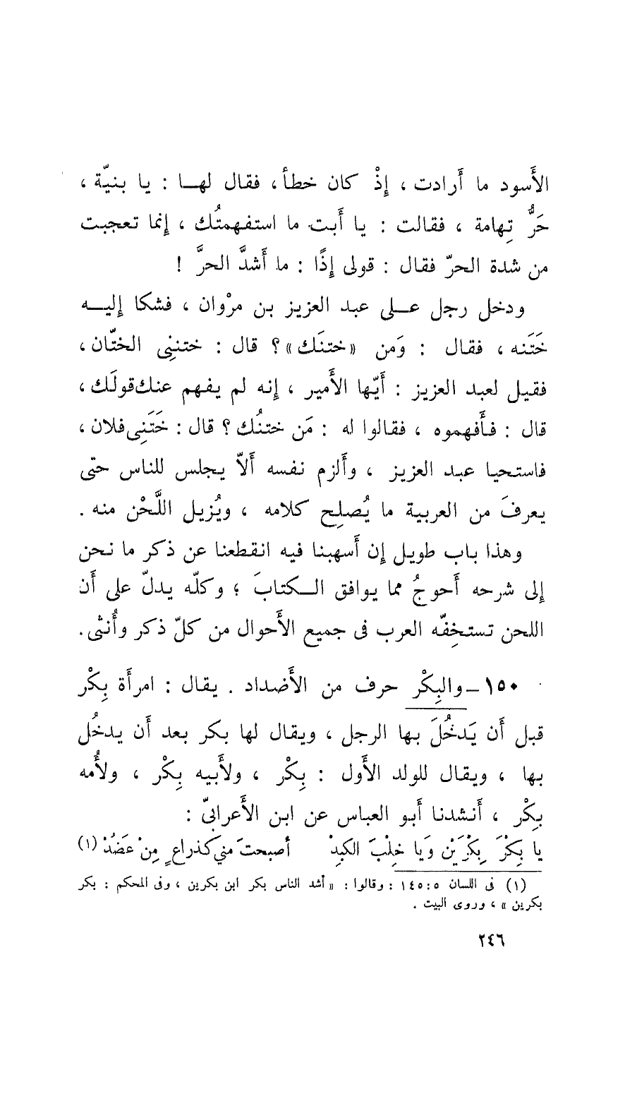 150 - والبِكْر حرف من الأَضْداد؛ يقال: امرأَة بِكْر قبل أَن يَدخُلَ بها الرَّجُل، ويقال لها بكر بعد أَن يدخُل بها، ويقال للولد الأَول: بِكْر، ولأَبيه بِكْر، ولأُمه بِكْر، أَنشدنا أَبو العباس عن ابن الأَعْرَابِيّ: