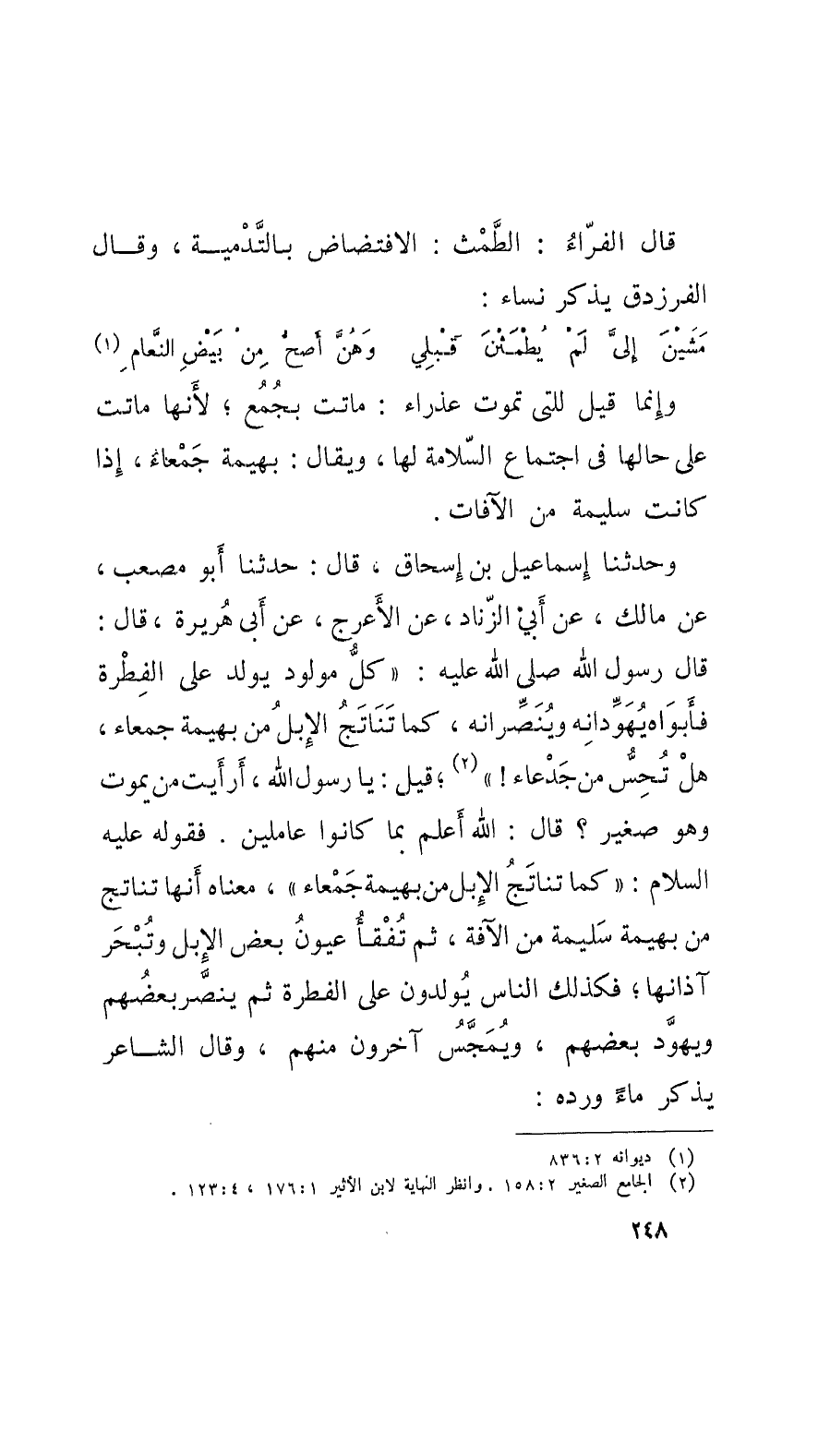 وحدثنا إسماعيل بن إسحاق، قال: حدَّثنا أَبو مصعب، عن مالك، عن أَبي الزّناد، عن الأَعرج، عن أَبي هريرة، قال: قال رَسُولُ الله صَلّى اللهُ عليه وسَلّم: كلُّ مولود يولد على الفِطْرة فأَبواه يُهَوِّدانِه ويُنَصِّرانه، كما تَناتَجُ الإبلُ من بهيمة جمعاء، هلْ تُحِسُّ من جَدْعاء!؛ قيل: يا رَسُولُ الله، أَرأَيت من يموت وهو صغير؟ قال: الله أَعلم بما كانوا عاملين. فقوله عليه السلام: كما تناتَجُ الإِبِل من بهيمة جمعاء، معناه أَنها تناتج من بهيمة سَليمة من الآفة، ثمَّ تُفْقَأُ عيونُ بعض الإِبِل وتُبْحَر آذانها؛ فكذلك النَّاس يولدون على الفطرة ثمَّ ينصَّر بعضُهم ويهوَّد بعضهُم، ويُمَجَّسُ آخرون منهم، وقالَ الشَّاعِر يذكر ماءً ورده: