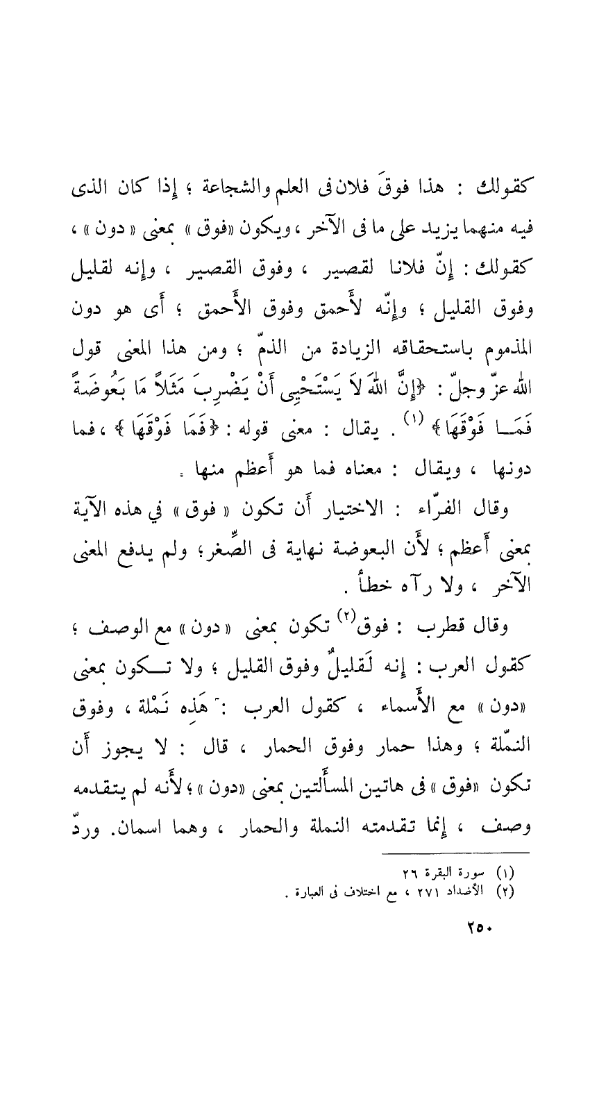 وقالَ الفَرَّاءُ: الاختيار أَن تكون فوق في هذه الآية بمَعْنَى أَعظم؛ لأَنَّ البعوضة نهاية في الصِّغر؛ ولم يدفع المعنى الآخر، ولا رآه خطأ.