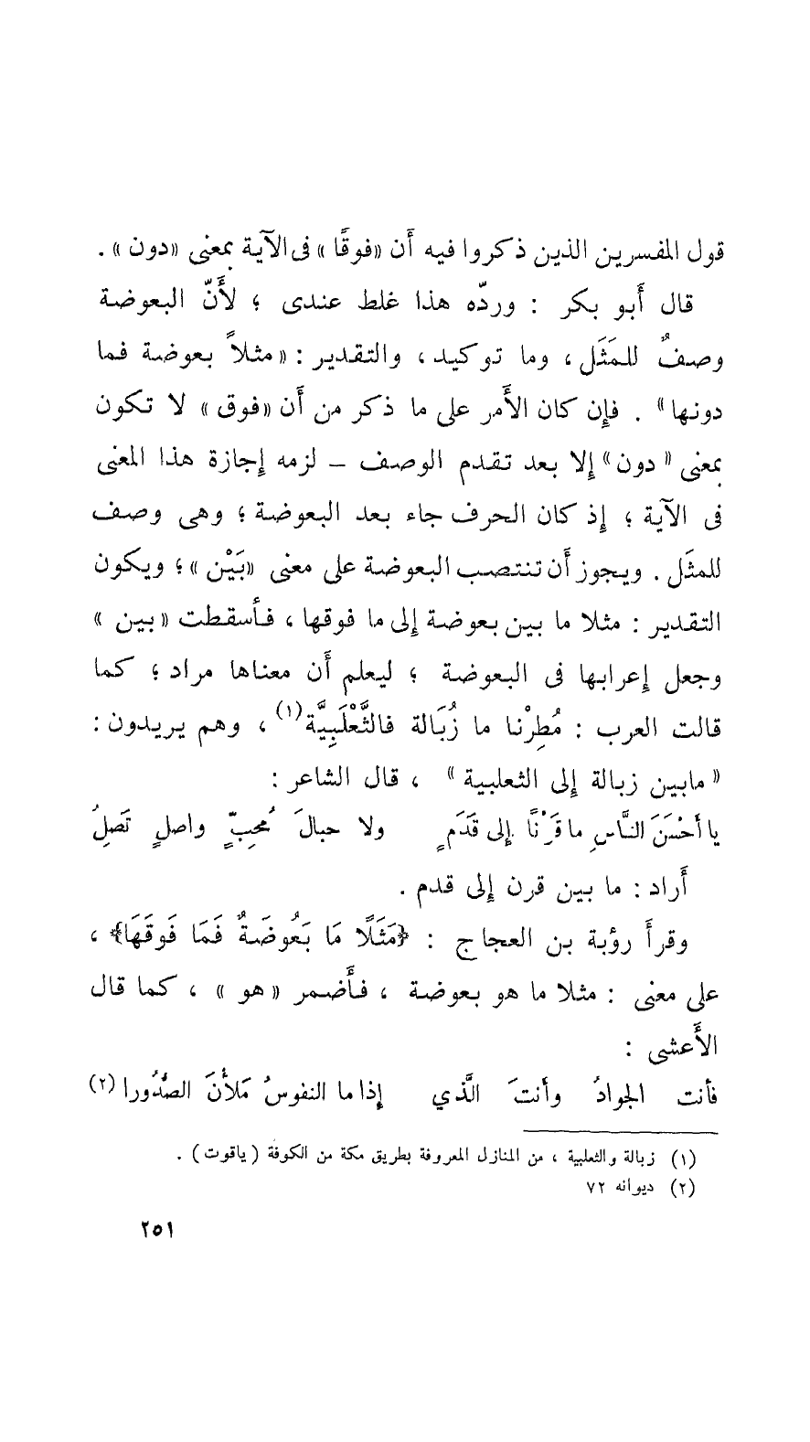 تكون بمَعْنَى دون إِلاَّ بعد تقدم الوصف، لزمه إجازة هذا المعنى في الآية؛ إذْ كان الحرف جاءَ بعد البعوضة؛ وهي وصف للمثَل. ويجوز أَن تنتصب البعوضة على معنى بَيْن؛ ويكون التقدير: مثلاً ما بين بعوضة إِلى ما فوقها، فأَسقطت بين وجعل إعرابها في البعوضة؛ ليعلم أَن معناها مراد؛ كما قالت العرب: مُطِرْنا ما زُبالة فالثَّعْلَبِيَّة، وهم يريدون: ما بين زبالة إِلى الثعلبية، قال الشَّاعِر: