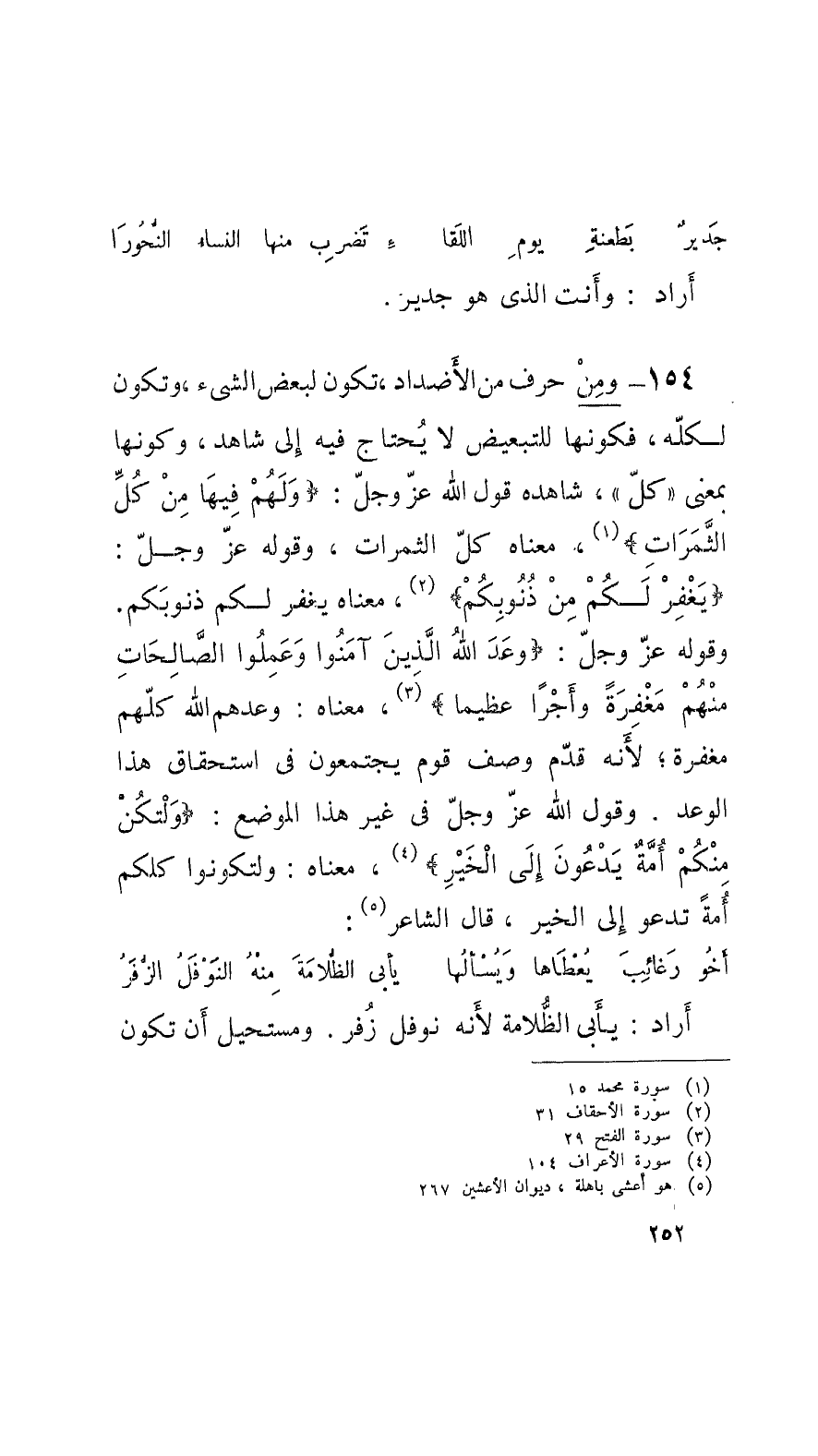 154 - ومِنْ حرف من الأَضْداد؛ تكون لبعض الشَّيْء، وتكون لكلّه، فكونها للتبعيض لا يُحتاج فيه إِلى شاهد، وكونها بمَعْنَى كلّ شاهده قول الله عزَ وجلّ: ولَهُمْ فيها مِنْ كُلِّ الثَّمَرات، معناه كلّ الثمرات، وقوله عزَ وجلّ: يَغْفِر لكم من ذُنوبكم، معناه يغفر لكم ذنوبكم. وقوله عزَ وجلّ: وعَدَ الله الذِّين آمَنوا وعَمِلوا الصَّالحات منْهُمْ مَغْفِرَةً وأَجْراً عظيما، معناه: وعدهم الله كلّهم مغفرة؛ لأَنَّه قدّم وصف قوم يجتمعون في استحقاق هذا الوعد. وقول الله عزَ وجلّ في غير هذا الموضع: ولْتكُنْ مِنْكُمْ أُمَّةٌ يَدْعون إِلى الخَيْرِ، معناه: ولتكونوا كلكم أُمةً تدعو إِلى الخير، قال الشَّاعِر: