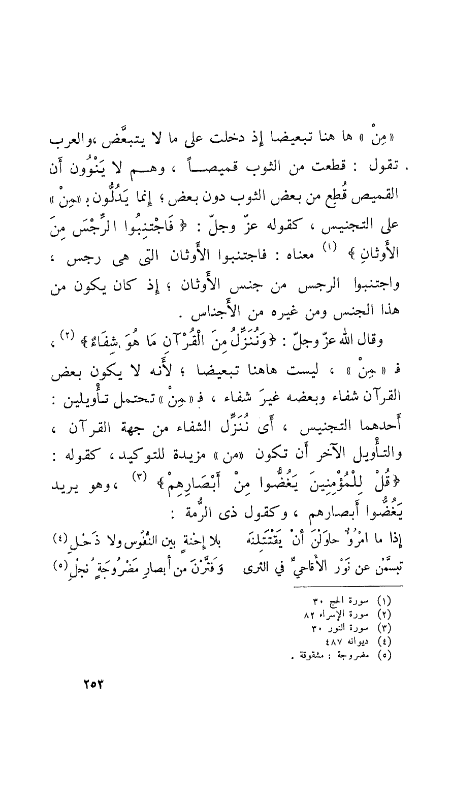 وقال الله عزَ وجلّ: ونُنَزِّلُ من القُرْآنِ ما هو شِفاءٌ، فمِنْ، لَيْسَتْ هاهنا تبعيضاً؛ لأَنَّه لا يكون بعض القرآن شفاء وبعضه غيرَ شفاء، فمِنْ تحتمل تأويلين: